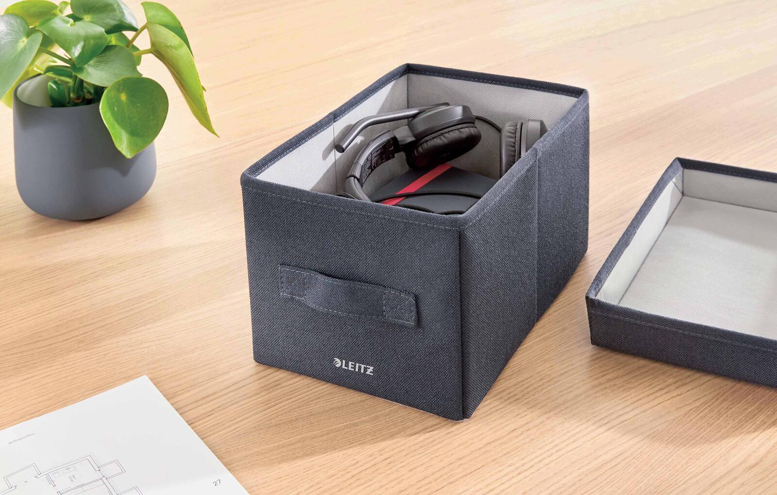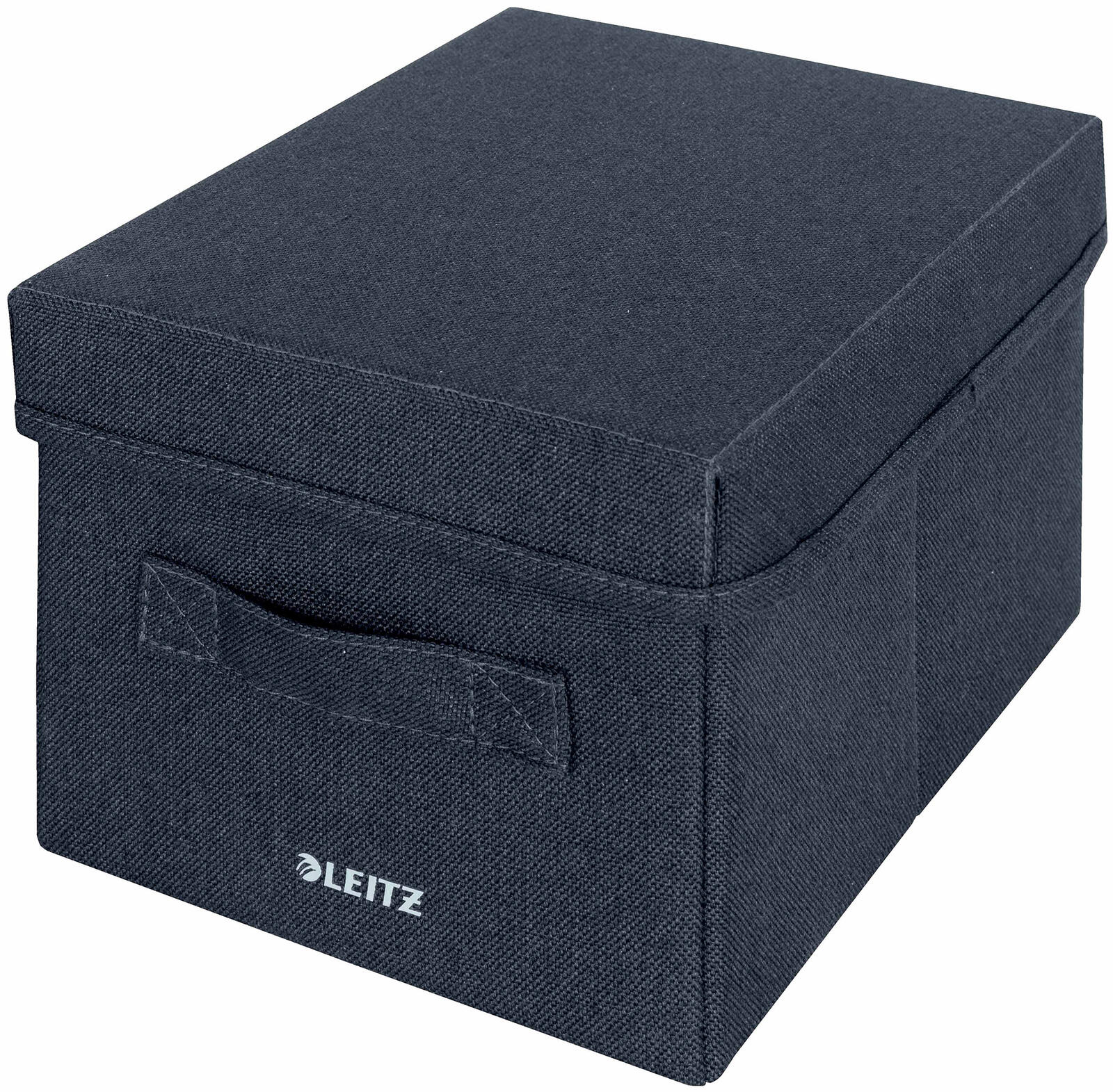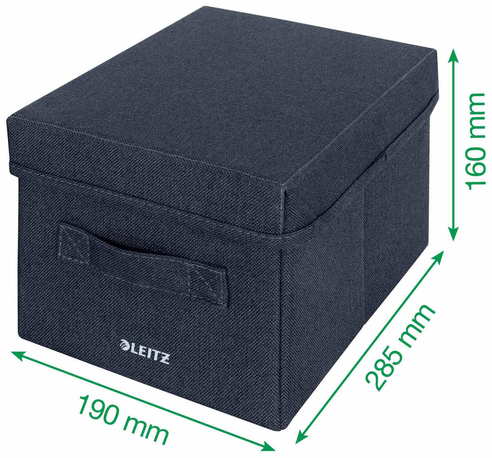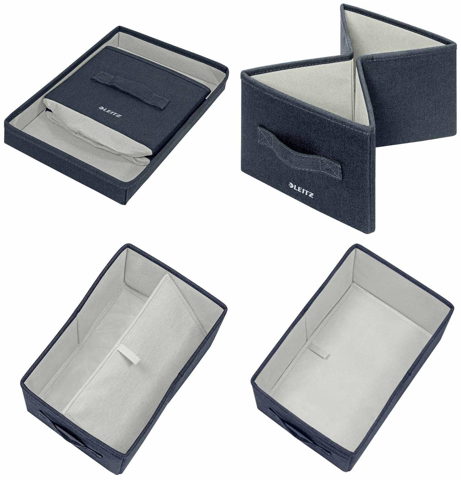 Die 2 LEITZ Aufbewahrungsboxen in elegantem Grau sind die perfekte Lösung für die ordentliche Aufbewahrung kleiner Büro- und Wohnaccessoires. Mit den Außenmaßen von 19,0 x 28,5 x 16,0 cm bieten sie ausreichend Platz für Ladegeräte, Fotos und viele andere Gegenstände, die du gerne ordentlich verstauen möchtest. Diese Boxen sind nicht nur praktisch, sondern auch ästhetisch ansprechend und fügen sich harmonisch in jedes Raumkonzept ein. Ein besonderes Merkmal dieser Aufbewahrungsboxen ist die Faltbarkeit. Wenn du die Boxen gerade nicht benötigst, lassen sie sich leicht zusammenfalten und platzsparend verstauen. Die seitlichen Griffe ermöglichen eine einfache Handhabung, sodass du die Boxen mühelos hin- und hertragen kannst. Hergestellt aus hochwertigem Textil und verstärkt mit robustem Karton, bieten sie nicht nur Stabilität, sondern sind auch zu 71% recyclebar, was sie zu einer umweltfreundlichen Wahl macht. Die graue Farbe verleiht den Boxen einen modernen Look und macht sie zu einem stilvollen Accessoire in deinem Zuhause oder Büro. Egal, ob du sie im Regal, auf dem Schreibtisch oder im Wohnbereich platzierst, sie sorgen für Ordnung und Übersichtlichkeit. Die 2 LEITZ Aufbewahrungsboxen sind somit nicht nur funktional, sondern auch ein echter Hingucker, der dein Raumdesign ergänzt. Mit diesem Set erhältst du zwei Boxen, die dir helfen, dein Umfeld aufgeräumt und ansprechend zu gestalten. Entdecke die Vorteile einer durchdachten Aufbewahrungslösung und genieße die Kombination aus Funktionalität und modernem Design.Technische Daten