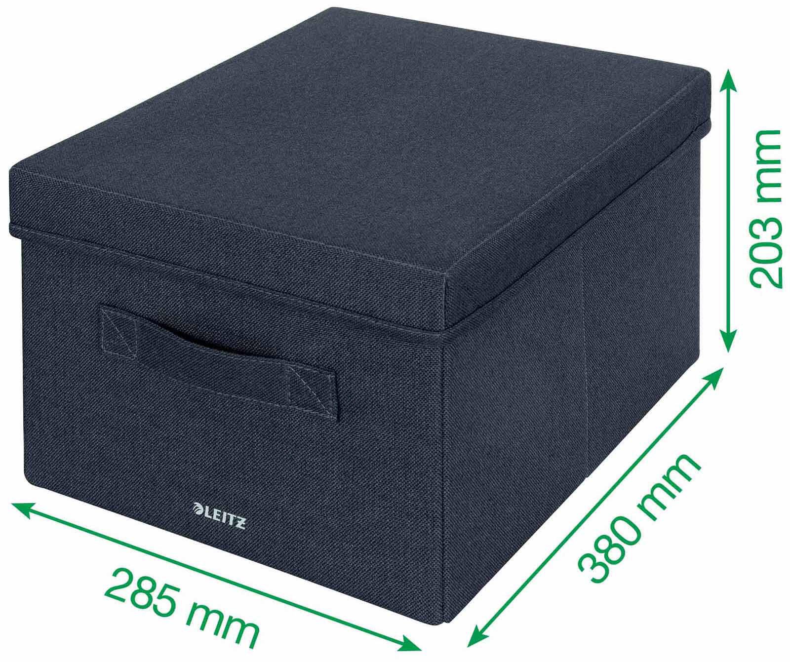 Die 2 LEITZ Aufbewahrungsboxen in elegantem Grau bieten eine stilvolle und praktische Lösung zur Aufbewahrung deiner Dokumente und Büroartikel. Mit den Außenmaßen von 28,5 x 38,0 x 20,3 cm sind sie ideal geeignet für A4-Dokumente, Tablets und andere Büromaterialien. Diese Boxen sind nicht nur funktional, sondern auch optisch ansprechend und passen perfekt in jedes moderne Büro oder Zuhause. Ein besonderes Merkmal dieser Aufbewahrungsboxen ist ihr durchdachtes Design. Sie sind faltbar und verfügen über seitliche Griffe, die den Transport und das Handling erleichtern. Zudem sind die Boxen zu 71 % recyclebar und bestehen aus hochwertig verstärktem Karton, was sowohl die Umwelt schont als auch für eine hohe Stabilität sorgt. Das verwendete Textilmaterial verleiht den Boxen eine ansprechende Haptik und macht sie zu einem stilvollen Accessoire in deinem Arbeitsbereich. Die praktischen Deckel der Boxen schützen den Inhalt vor Staub und sorgen dafür, dass alles ordentlich und sicher verstaut ist. So bleibt dein Arbeitsplatz aufgeräumt und du hast jederzeit Zugriff auf deine wichtigen Unterlagen. Mit einem Pack von zwei Boxen erhältst du nicht nur eine praktische Aufbewahrungslösung, sondern auch ein attraktives Design-Element, das deinem Raum eine besondere Note verleiht. Vertraue auf die Qualität von LEITZ und genieße die Vorteile dieser vielseitigen Aufbewahrungsboxen, die sowohl funktional als auch stilvoll sind.Technische Daten