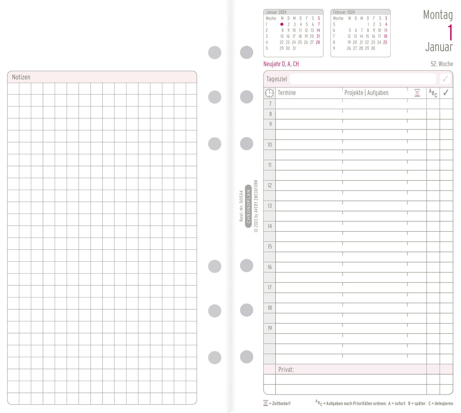 Die Struktur der Kalendereinlage, die einen Tag auf zwei Seiten abbildet, ermöglicht es Ihnen, Ihre täglichen Termine, Aufgaben und Notizen übersichtlich zu gestalten. Dies fördert nicht nur die Effizienz, sondern erleichtert auch die Planung und das Zeitmanagement. Egal, ob im Beruf oder im privaten Bereich, mit dieser Kalendereinlage behalten Sie stets den Überblick über Ihre wichtigsten Verpflichtungen.