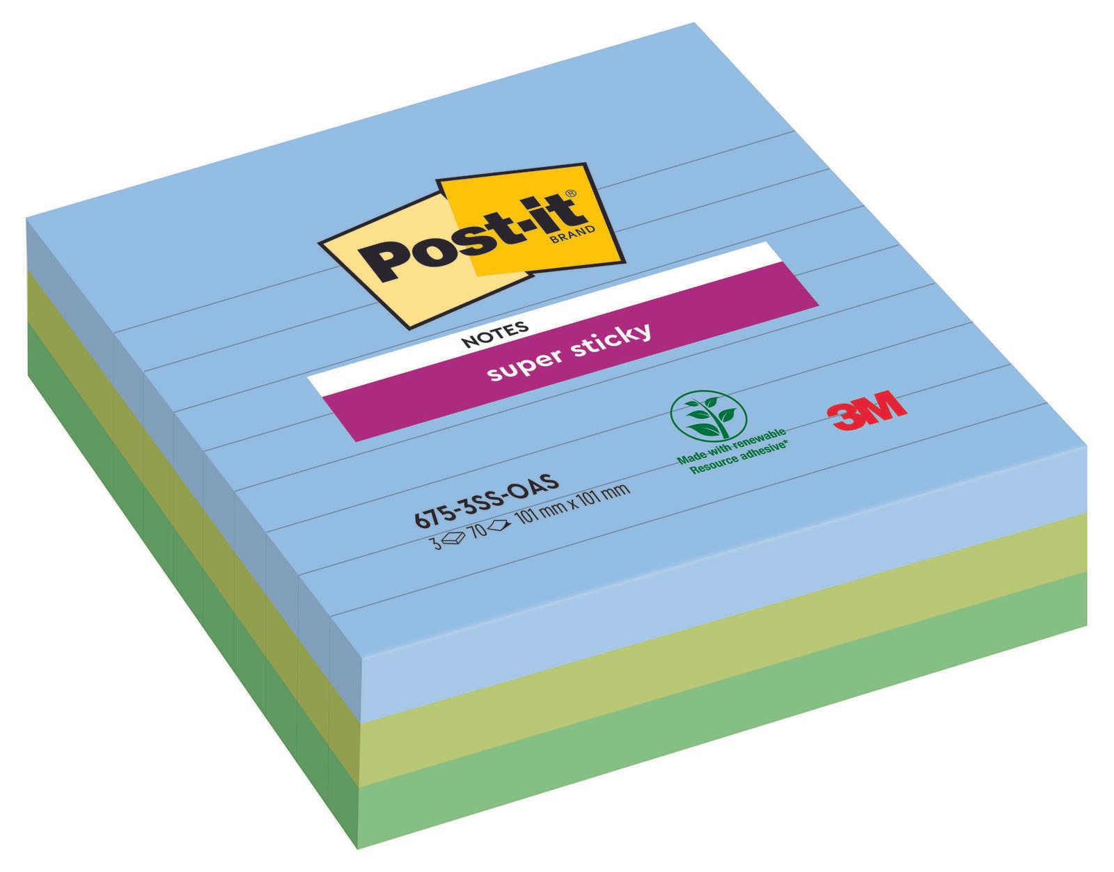 Die Post-it® Super Sticky Oasis Haftnotizen in der Größe 10,0 x 10,0 cm sind die perfekte Lösung für alle, die ihre Gedanken und Ideen schnell und effektiv festhalten möchten. Mit einem Block, der 70 Blätter umfasst, bieten diese Haftnotizen ausreichend Platz für Notizen, Erinnerungen oder kreative Skizzen. Die farbsortierten Notizen in den ansprechenden Tönen denimblau, limonengrün und immergrün bringen nicht nur Farbe in deinen Arbeitsalltag, sondern helfen auch dabei, wichtige Informationen hervorzuheben. Die extrastarke Haftung dieser Notizen sorgt dafür, dass sie auch auf schwierigen Oberflächen zuverlässig haften bleiben. Egal, ob du sie an deinem Computer, auf dem Kühlschrank oder an einer Wand anbringst, du kannst dir sicher sein, dass sie dort bleiben, wo du sie platziert hast. Das praktische Blockformat ermöglicht es dir, die Notizen einfach abzutrennen und überall mitzunehmen, ohne dass sie beschädigt werden. Hergestellt aus hochwertigem Papier, bieten die Post-it® Super Sticky Oasis Haftnotizen nicht nur eine hervorragende Schreiboberfläche, sondern sind auch umweltfreundlich, da sie aus nicht-recyclingfähigem Papier bestehen. Die liniert gestalteten Blätter sind ideal für strukturierte Notizen und helfen dir, deine Gedanken klar und übersichtlich zu organisieren. Mit der praktischen Verpackung von drei Blöcken hast du immer genügend Haftnotizen zur Hand, egal ob für den Einsatz im Büro, zu Hause oder in der Schule. Vertraue auf die Qualität von Post-it® und erlebe, wie diese Super Sticky Oasis Haftnotizen deine Produktivität steigern und dir helfen, den Überblick zu behalten.Technische Daten