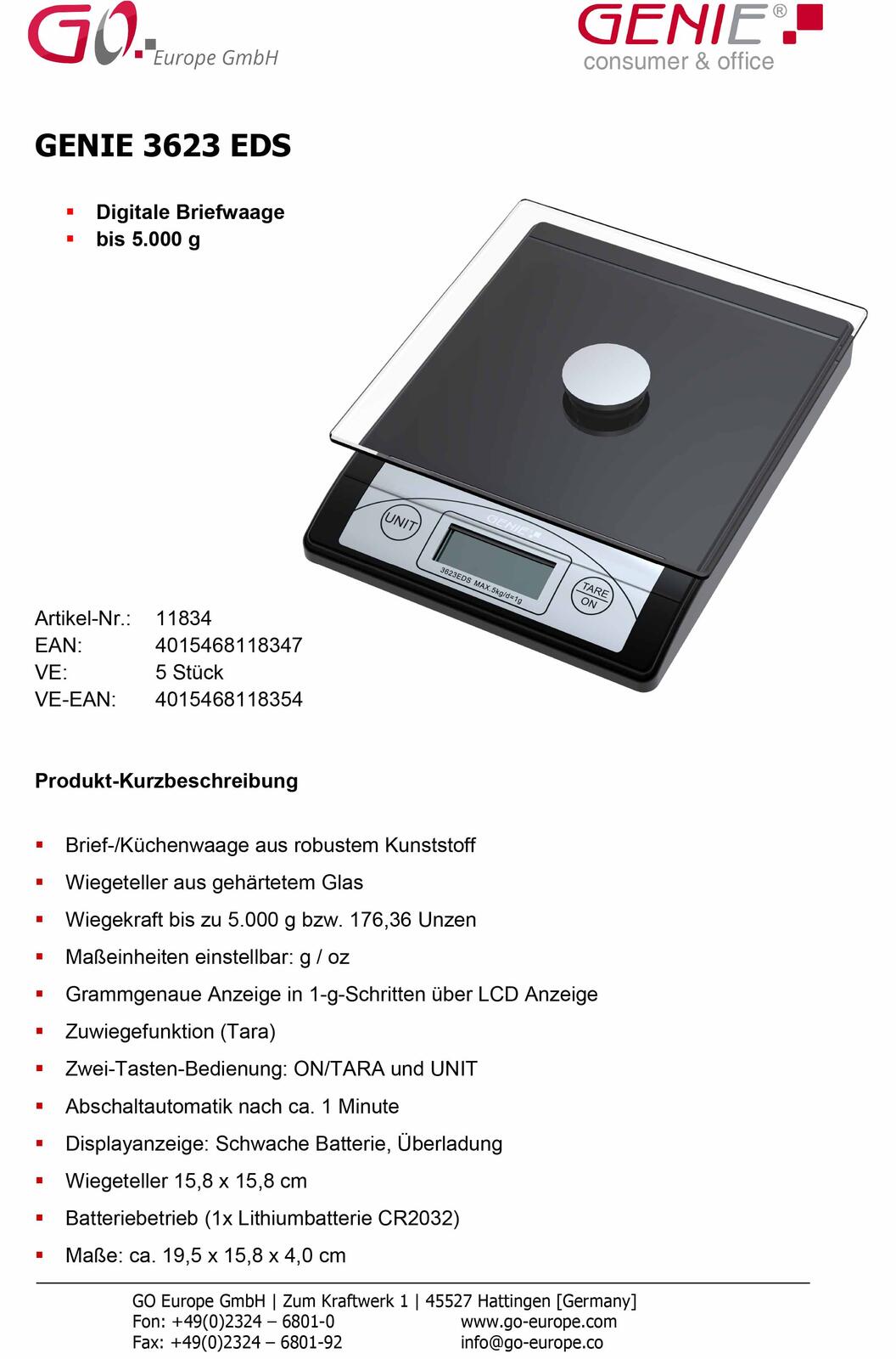 Die Genie Briefwaage 3623 EDS besticht durch ihre hochwertige Verarbeitung aus Kunststoff und Glas, was sie besonders langlebig und stabil macht. Diese zuverlässige Waage ist ein unverzichtbares Tool für zu Hause, im Büro oder überall dort, wo präzises Wiegen gefragt ist.