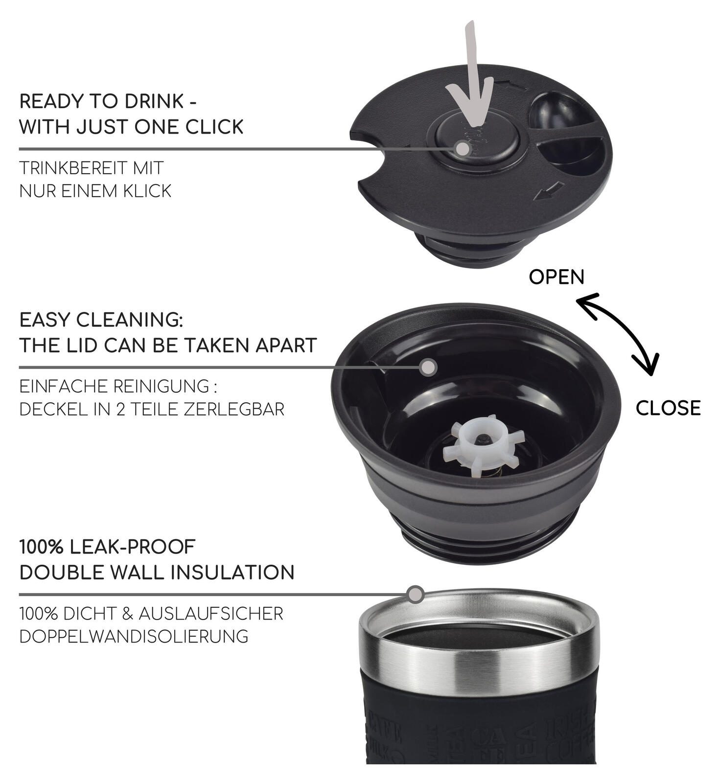 Die doppelwandige Edelstahlkonstruktion sorgt dafür, dass heiße Getränke bis zu 6 Stunden heiß und kalte Getränke bis zu 12 Stunden kalt bleiben. So kannst du deinen Kaffee oder Tee stets in optimaler Trinktemperatur genießen, egal wohin dich dein Tag führt.