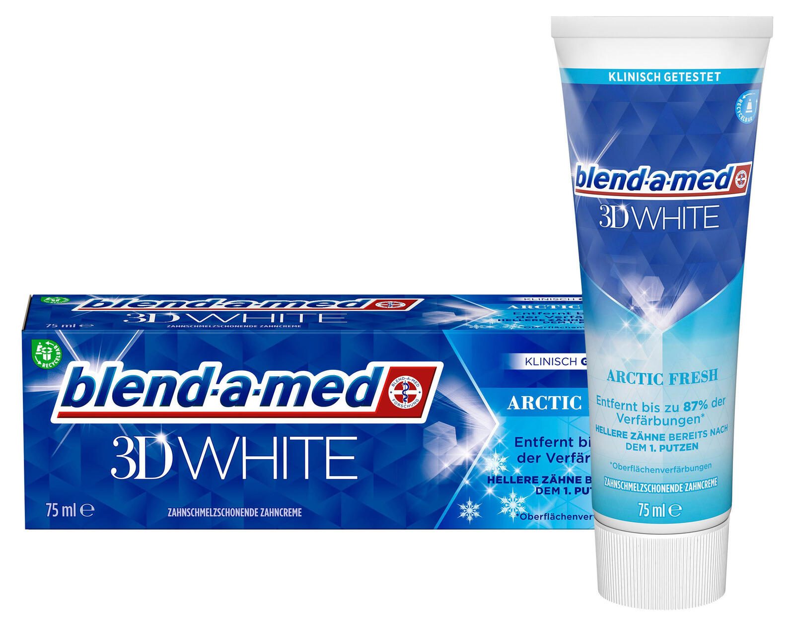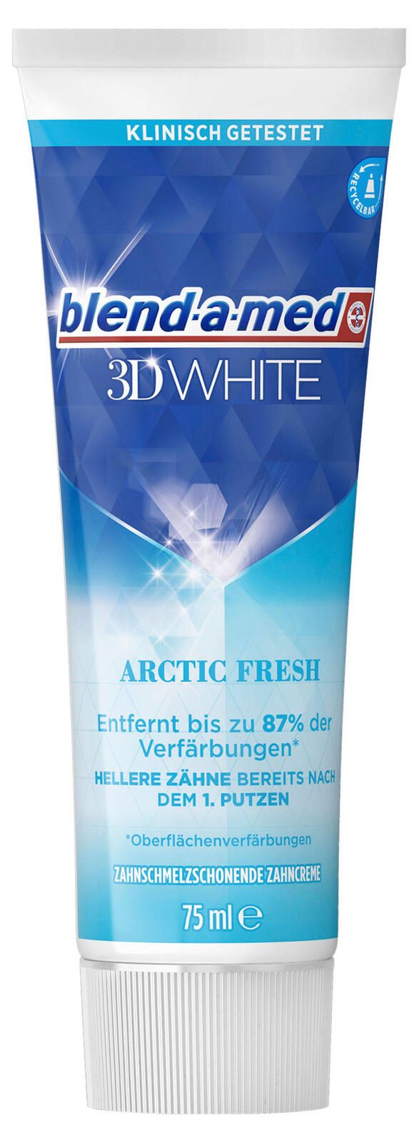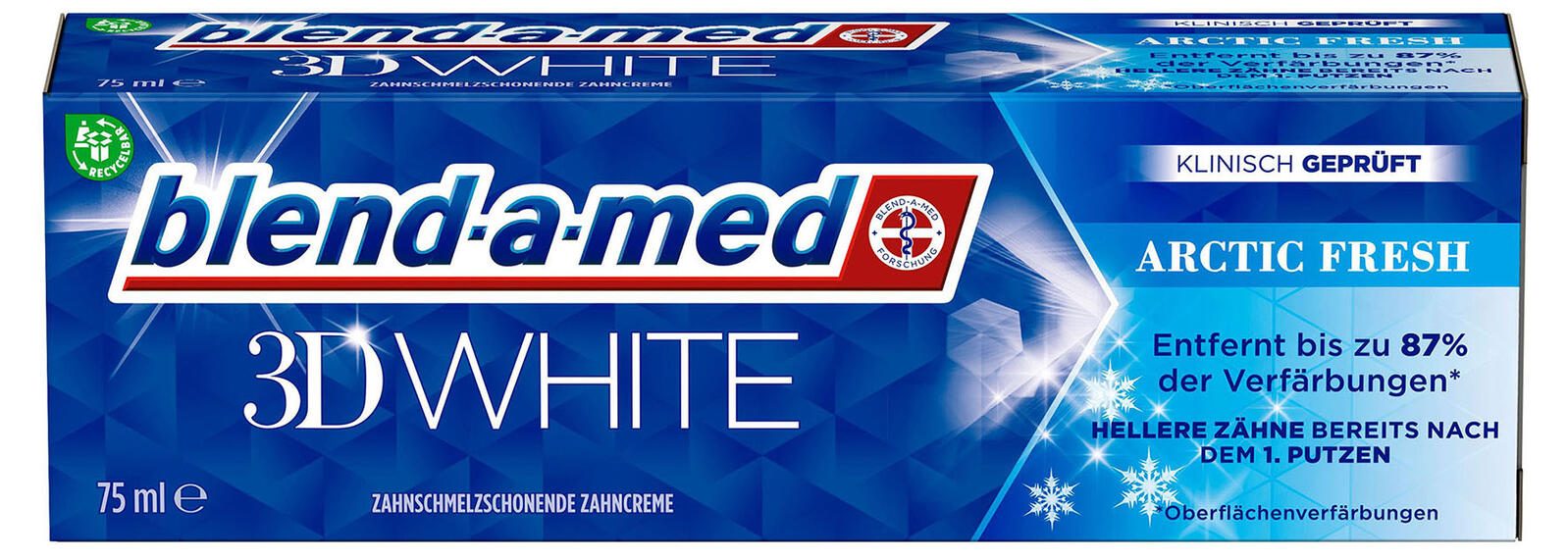 Die blend-a-med Zahncreme 3D White bringt dir strahlend weiße Zähne in einer handlichen 75 ml Tube. Dank ihrer innovativen Formel entfernt sie bis zu 87% der Oberflächenverfärbungen bereits nach dem ersten Putzen.