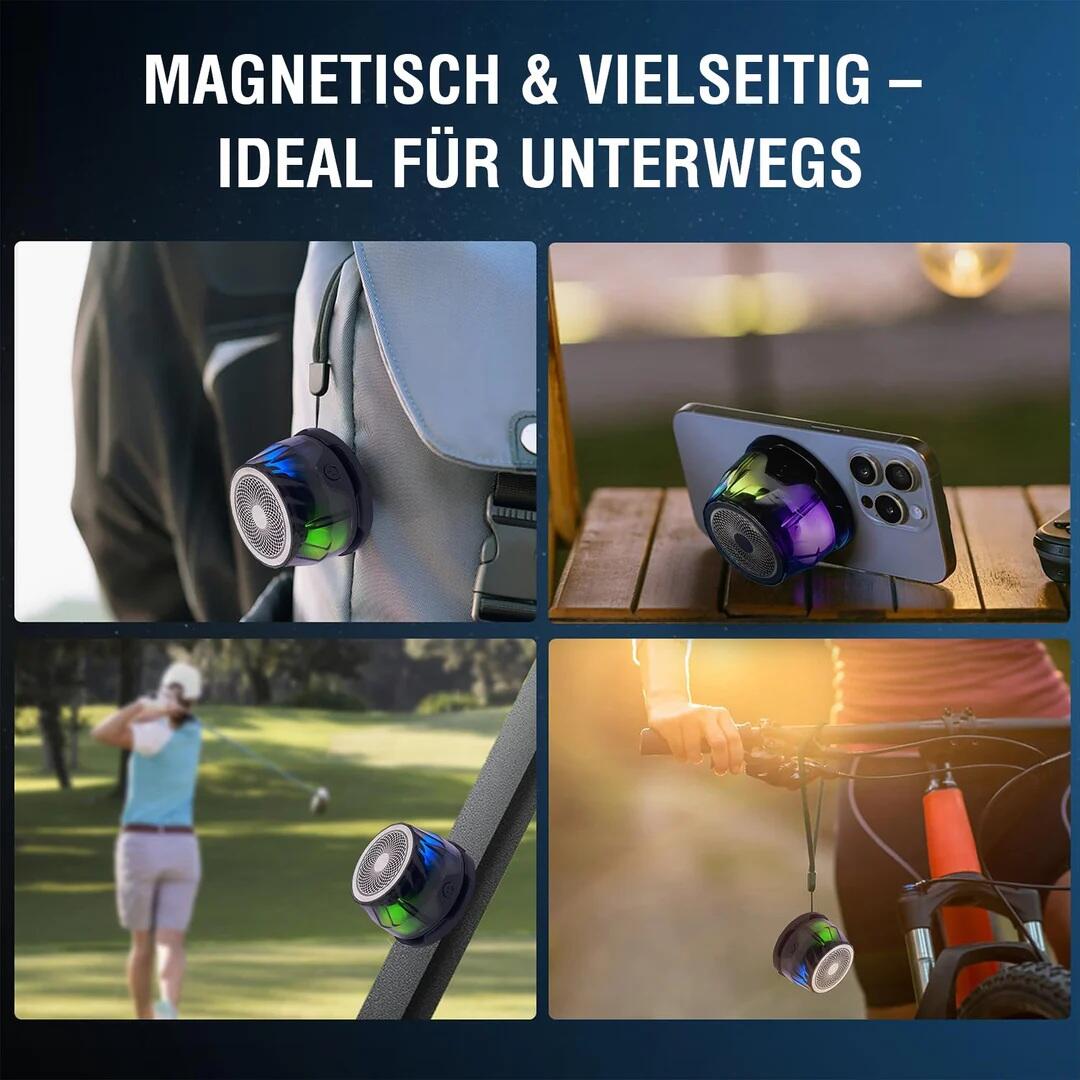 Dieser Bluetooth-Lautsprecher, perfekt abgestimmt auf die iPhone 16 Serie dank MagSafe-Kompatibilität, ist dein vielseitiger Begleiter für Gaming und Entertainment. Mit dem beiliegenden Magnetring haftet er sicher an metallischen Flächen wie Fitnessgeräten und findet auch an nichtmetallischen Oberflächen in der Küche oder am Arbeitsplatz festen Halt.