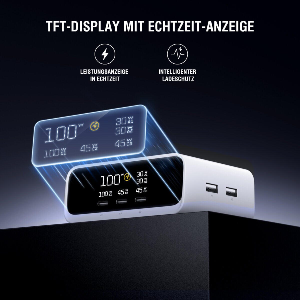 - Digitale Anzeige: Echtzeit-Display zeigt präzise Wattzahl pro Anschluss und die Gesamtleistung für volle Transparenz