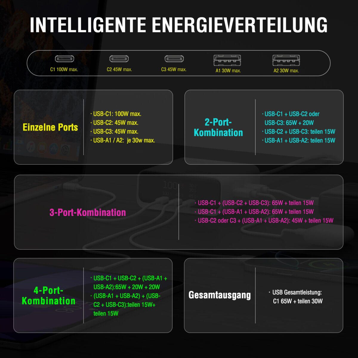 - 100W Schnellladen: Ein USB-C Port liefert volle 100W für Laptops, bei mehreren Geräten wird die Leistung intelligent verteilt