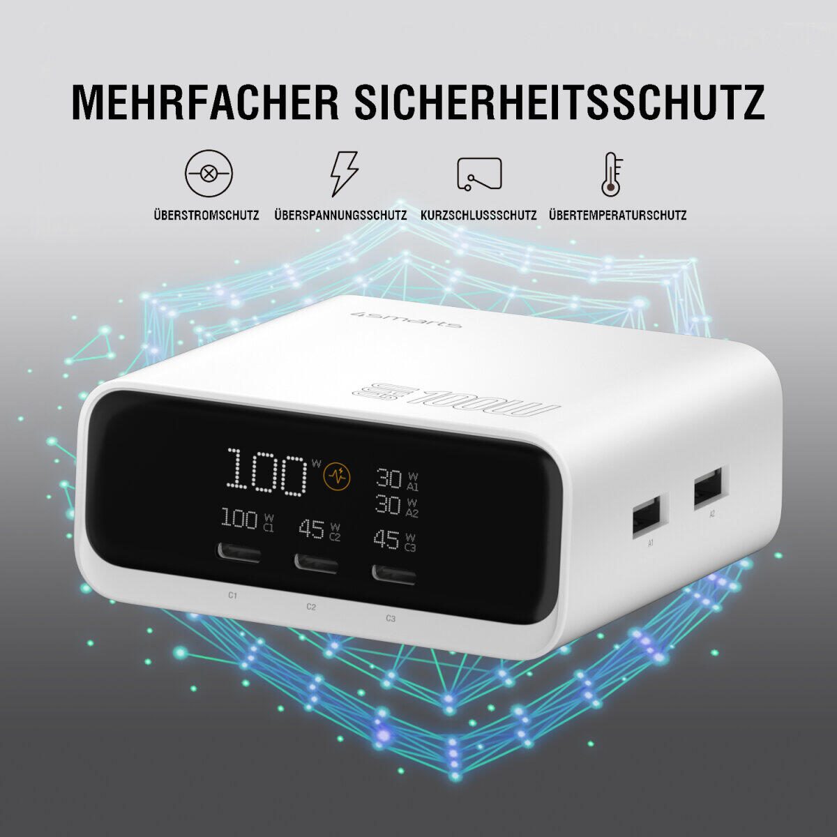 Ob wertvoller Laptop oder empfindliche Kopfhörer – deine Geräte sind geschützt. Eingebaute Multi-Schutzfunktionen bewahren vor Kurzschluss, Überhitzung, Überspannung und Überstrom. So kannst du dich ganz auf Arbeit oder Freizeit konzentrieren, während deine Geräte sicher laden.