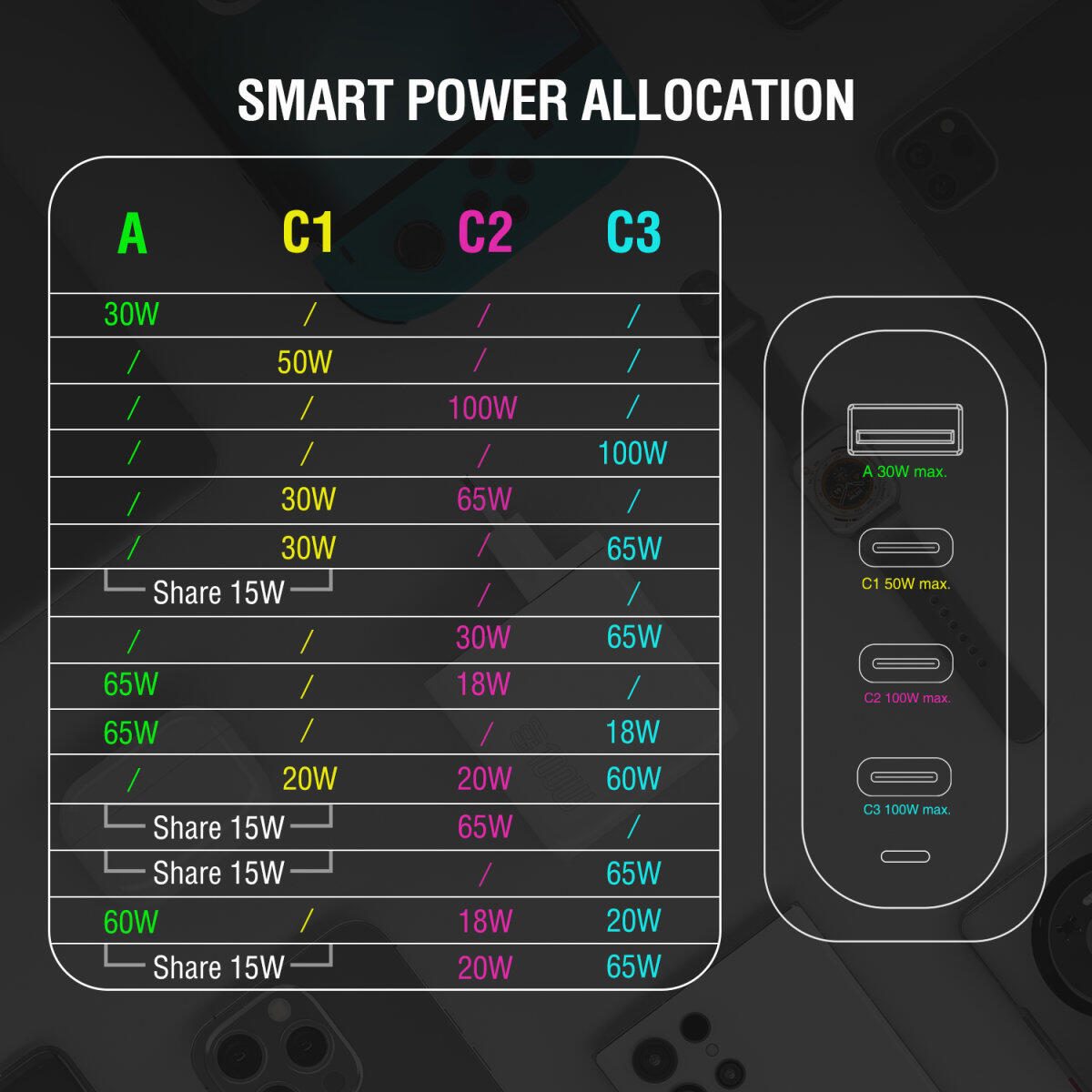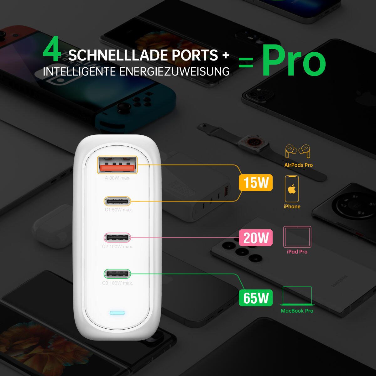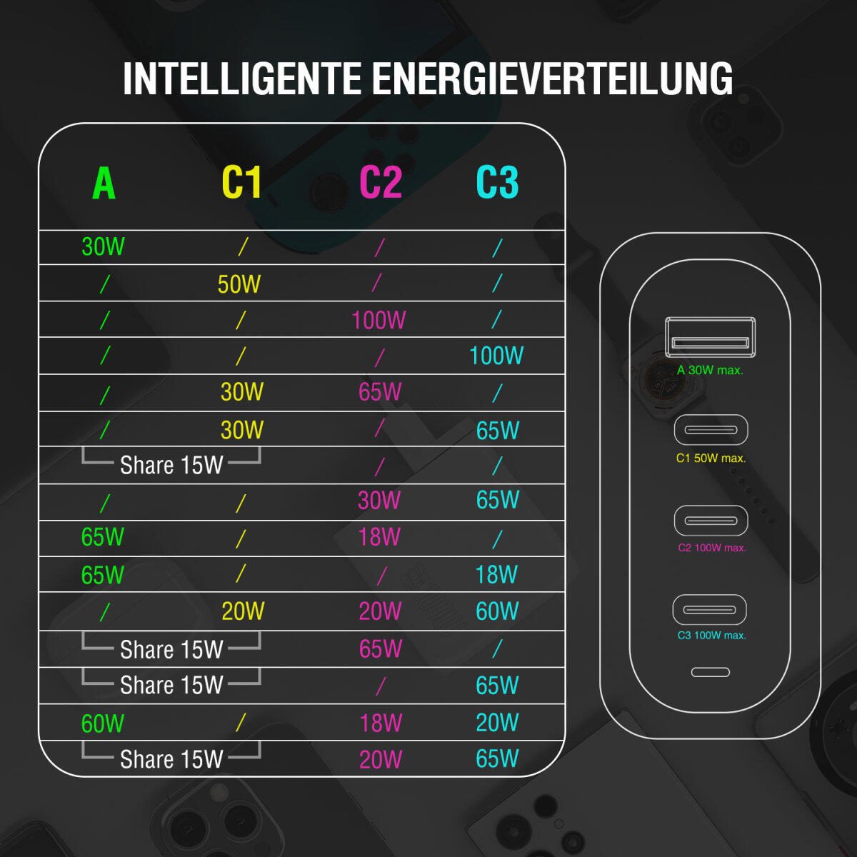 - Multi-Geräte-Ladefähigkeit: Aufladen von bis zu vier Geräten gleichzeitig mit einer Gesamtleistung von 100W