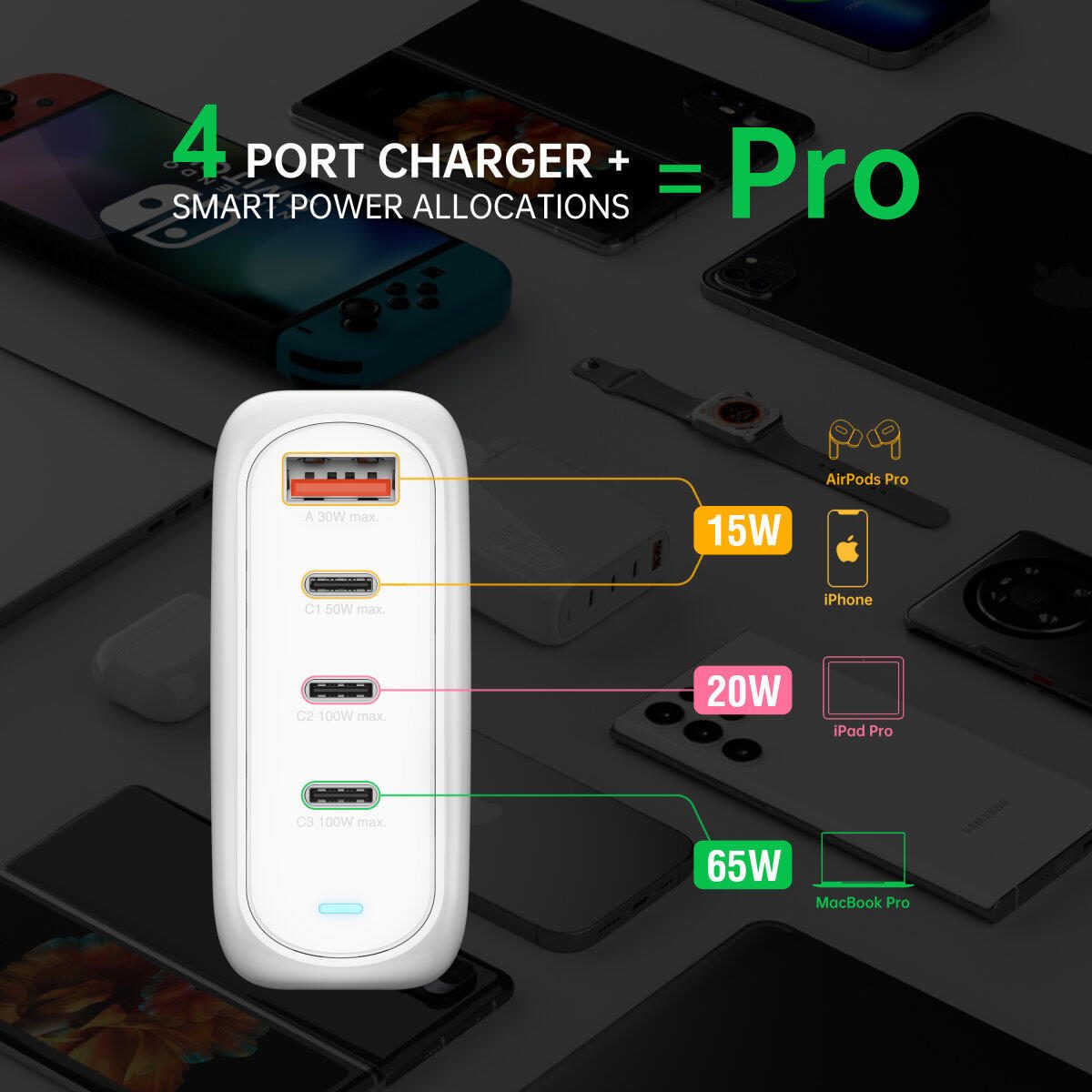 Egal, ob Smartphone, Tablet, Laptop, TWS-Kopfhörer, Powerbank oder Smartwatch – dieses Ladegerät kann alles. Mit 3 USB-C-Ports und 1 USB-A-Anschluss bietet es die Möglichkeit, bis zu vier Geräte gleichzeitig zu laden. Die Gesamtleistung von 100W sorgt dafür, dass selbst leistungshungrige Geräte wie Laptops schnell aufgeladen werden, während kleinere Gadgets sicher und effizient mit Energie versorgt werden.