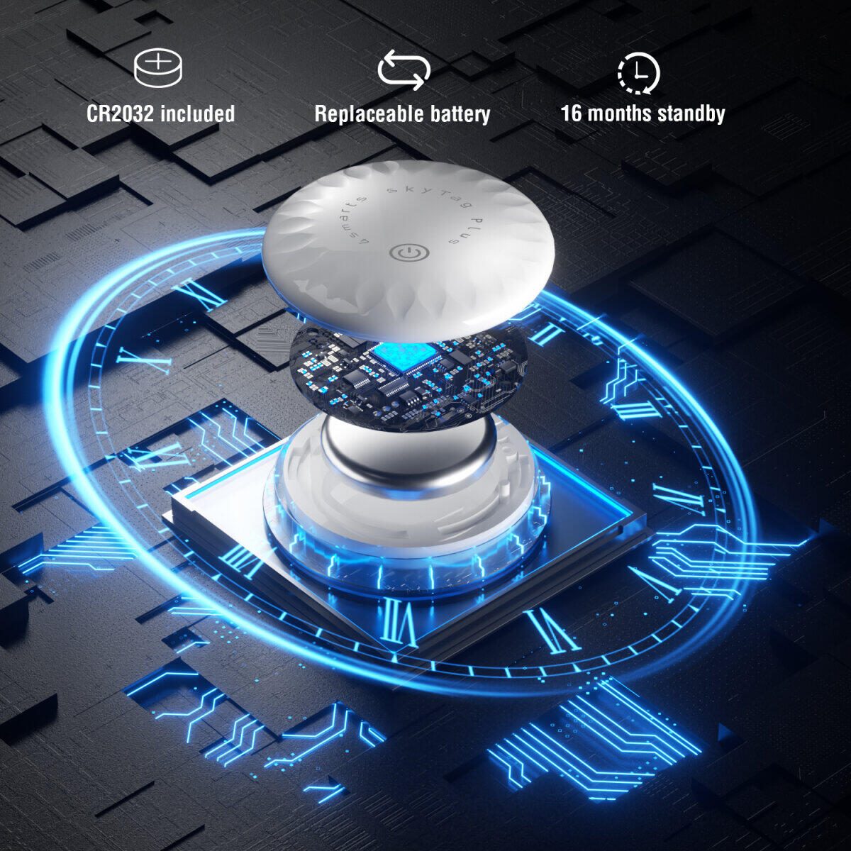 Die austauschbare CR2032-Knopfzelle des SkyTags sorgt für bis zu 16 Monate Standby-Zeit. Dadurch kannst du den SkyTag über einen langen Zeitraum nutzen, ohne dir Gedanken über die Stromversorgung machen zu müssen. Selbst bei regelmäßiger Nutzung bleibt die Leistung konstant. Wenn die Batterie leer ist, lässt sie sich schnell und einfach austauschen. Diese Kombination aus Langlebigkeit und Effizienz macht den SkyTag Plus besonders praktisch und wartungsarm.