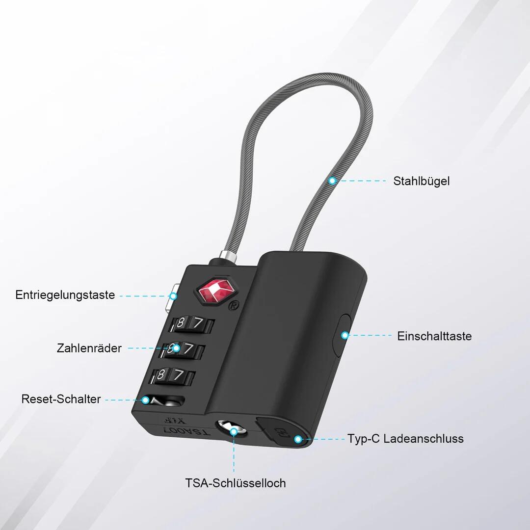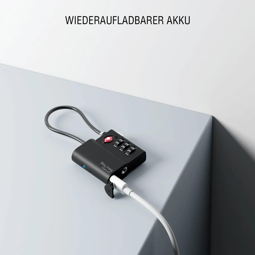 Setze auf Nachhaltigkeit und Komfort. Unser Schloss verfügt über einen langlebigen, wiederaufladbaren Akku, der nicht nur die Umwelt schont, sondern auch deine Reise einfacher macht. Keine lästigen Batteriewechsel mehr – einfach mit deinem USB-C-Ladekabel und Netzteil deines Smartphones aufladen und losreisen. Das spart dir Zeit und Geld und ist gut für die Umwelt.
