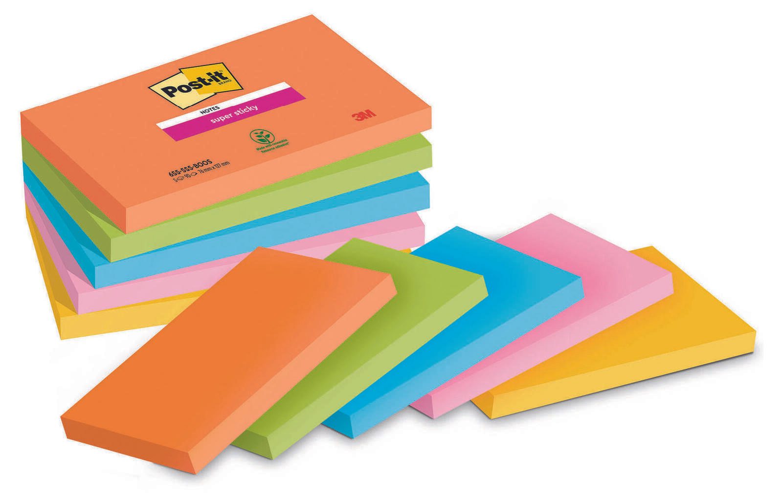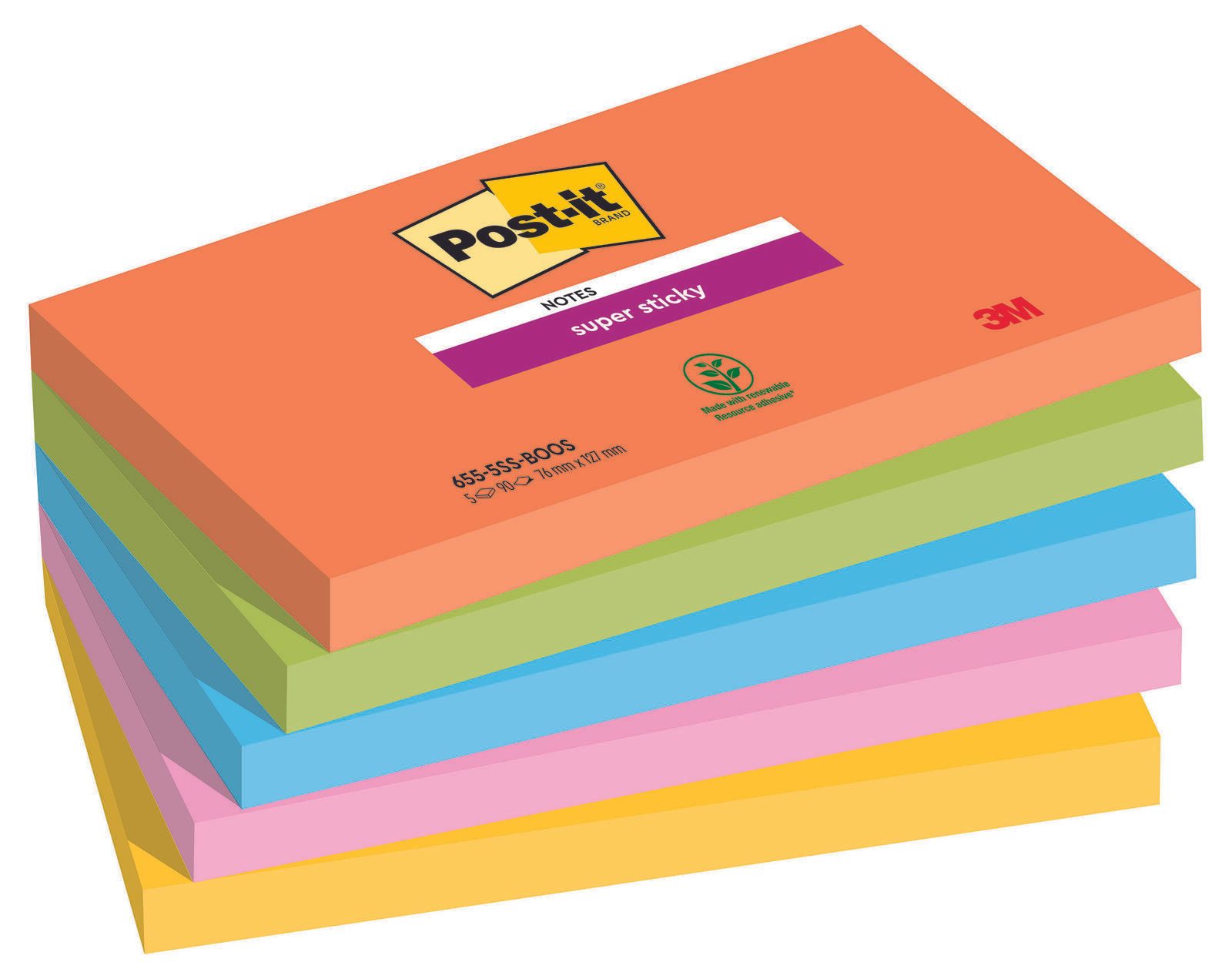 Die Post-it® Super Sticky Notes Bangkok Collection sind die perfekten Begleiter für alle, die ihre Gedanken und Ideen festhalten möchten. Diese Haftnotizen in der praktischen Größe von 12,7 x 7,6 cm bieten dir ausreichend Platz, um Notizen, Erinnerungen oder kreative Ideen festzuhalten. Mit einer extrastarken Haftung bleiben die Notizen zuverlässig an Ort und Stelle, egal ob an Wänden, Monitoren oder anderen Oberflächen. Die farbenfrohe Auswahl der Vitalfarben – vitalorange, limonengrün, paradiseblau, tropicalpink und ultragelb – bringt frischen Schwung in deinen Arbeitsalltag. Diese lebendigen Farben fördern nicht nur die Kreativität, sondern helfen auch dabei, wichtige Informationen auf einen Blick zu erfassen. Die Haftnotizen sind in einem Blockformat erhältlich, wobei jeder Block mit 90 Blatt ausgestattet ist. Somit hast du genügend Platz für all deine Gedanken und kannst sie jederzeit griffbereit haben. Hergestellt aus hochwertigem Papier bieten die Post-it® Super Sticky Notes nicht nur eine hervorragende Haftung, sondern sind auch einfach zu beschriften. Egal, ob du sie im Büro, zu Hause oder in der Schule verwendest, diese Haftnotizen sind vielseitig einsetzbar und erleichtern dir die Organisation deiner Ideen. Mit der Bangkok Collection bringst du nicht nur Farbe, sondern auch Struktur in deinen Alltag. Die selbstklebenden Haftnotizen sind ideal für schnelle Notizen, To-Do-Listen oder kreative Projekte. Entdecke die Vorteile der Post-it® Super Sticky Notes und erlebe, wie sie dir helfen, deine Gedanken klar und strukturiert festzuhalten.Technische Daten