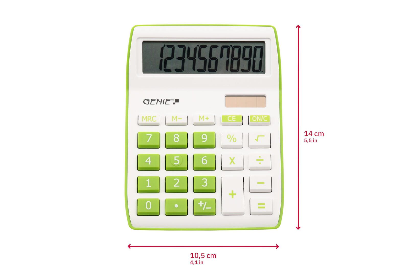 Der GENIE Tischrechner 840g in elegantem Weiß und Grün vereint Funktionalität und modernes Design. Mit seiner praktischen Abschaltautomatik sorgt er dafür, dass Sie sich keine Sorgen um die Batterielebensdauer machen müssen. Der Tischrechner ist sowohl mit Batterie als auch mit Solarenergie betrieben, was ihn besonders umweltfreundlich und vielseitig einsetzbar macht.