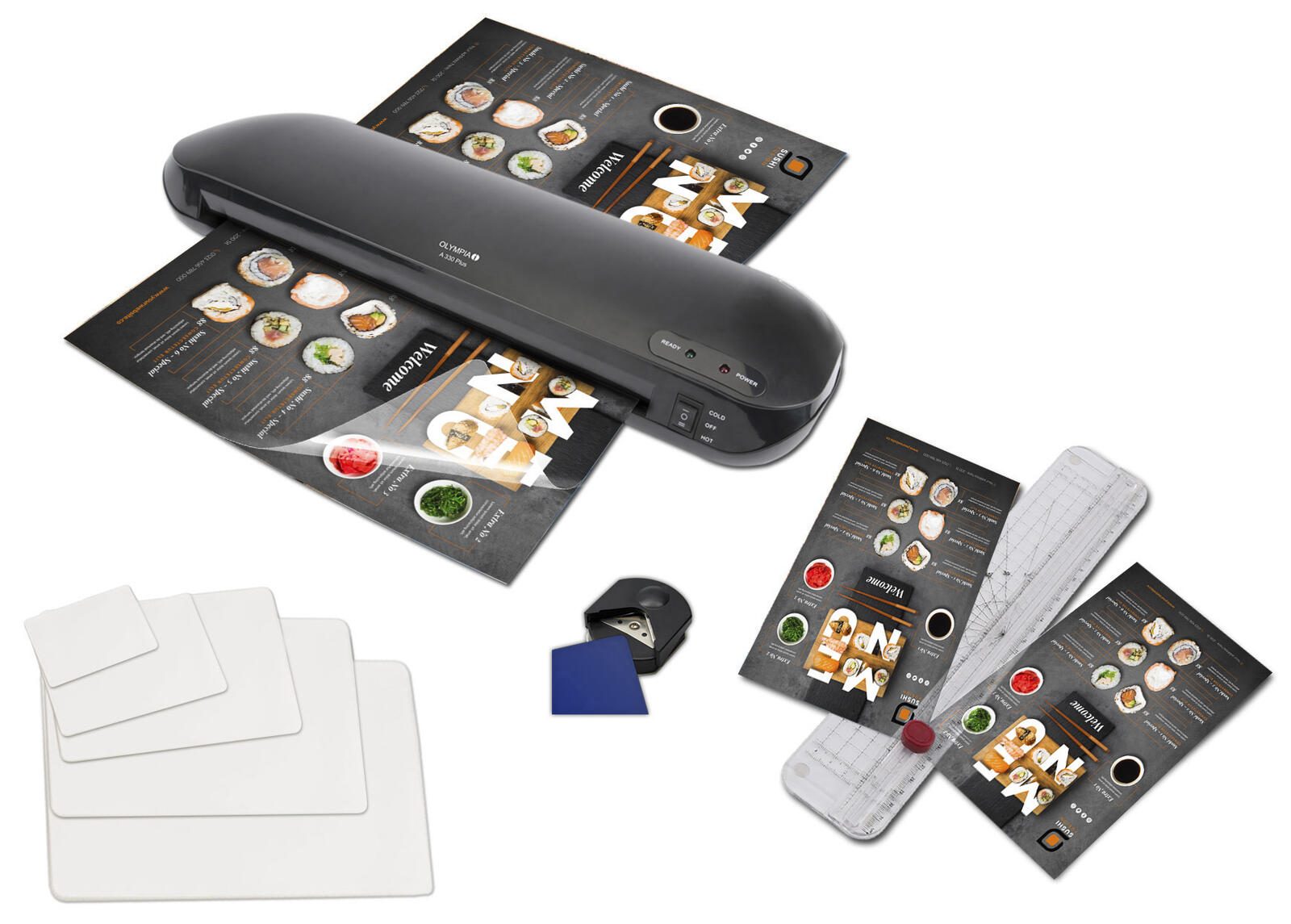 Das OLYMPIA Laminiergerät-Set A330+ in elegantem Schwarz vereint Funktionalität und Sicherheit in einem kompakten Design. Mit einer Leistungsaufnahme von 400 W bietet dieses Laminiergerät eine beeindruckende Leistung, die dir hilft, Dokumente, Fotos und andere wichtige Materialien schnell und effizient zu laminieren. Die maximale Folienstärke von 125 Mikron pro Seite sorgt dafür, dass deine Laminierungen sowohl robust als auch professionell aussehen. Ein herausragendes Merkmal des OLYMPIA A330+ ist der integrierte Überhitzungsschutz. Dieser Sicherheitsmechanismus schützt das Gerät vor Schäden und sorgt dafür, dass du dich beim Laminieren auf die Qualität der Ergebnisse konzentrieren kannst. Egal, ob du im Büro, in der Schule oder zu Hause arbeitest, das Laminiergerät ist ideal für alle, die Wert auf langlebige und gut geschützte Dokumente legen. Die schlichte schwarze Farbe des Geräts fügt sich nahtlos in jede Umgebung ein und macht es zu einem stilvollen Werkzeug für dein Büro oder deinen Arbeitsplatz. Mit dem OLYMPIA Laminiergerät-Set A330+ erhältst du nicht nur ein leistungsstarkes Gerät, sondern auch die Gewissheit, dass deine Materialien optimal geschützt sind. Egal, ob du wichtige Dokumente für Präsentationen, kreative Bastelprojekte oder persönliche Erinnerungen laminieren möchtest, das OLYMPIA Laminiergerät-Set A330+ bietet dir die Vielseitigkeit und Zuverlässigkeit, die du benötigst. Vertraue auf die Qualität und die durchdachten Eigenschaften dieses Laminiergeräts, um deine Arbeiten professionell zu präsentieren und langfristig zu bewahren.Technische Daten
