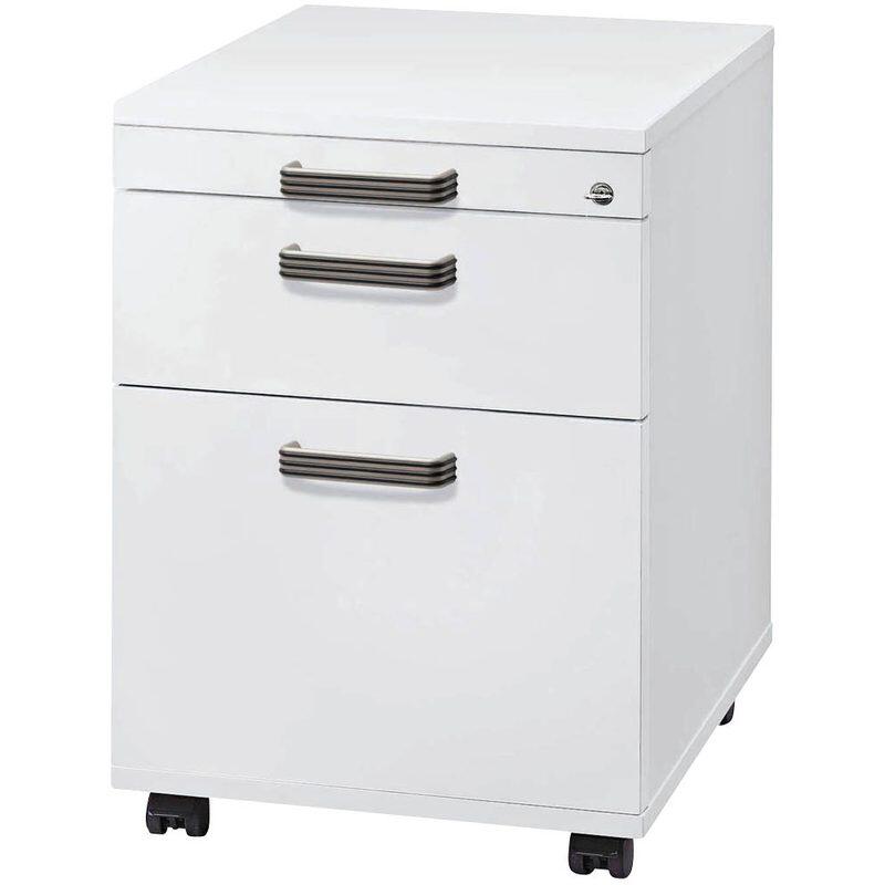 Der HAMMERBACHER Rollcontainer VAC20/W/W/SG in elegantem Weiß vereint Funktionalität und modernes Design auf harmonische Weise. Mit seinen kompakten Maßen von 42,8 x 58,0 x 59,0 cm passt dieser Rollcontainer ideal unter jeden Schreibtisch und bietet gleichzeitig ausreichend Stauraum für deine Unterlagen und Büromaterialien. Die Ausführung mit Selbsteinzug und Soft-Stopp sorgt dafür, dass die Schubladen sanft und leise schließen, was besonders in ruhigen Arbeitsumgebungen von Vorteil ist. Der Rollcontainer verfügt über drei geräumige Schubladen, die dir helfen, Ordnung zu halten und schnellen Zugriff auf wichtige Dokumente zu ermöglichen. Der praktische Bügelgriff aus Kunststoff erleichtert das Öffnen der Schubladen und verleiht dem Container zudem eine ansprechende Optik. Hergestellt aus hochwertiger Spanplatte, ist der HAMMERBACHER Rollcontainer nicht nur stabil und langlebig, sondern auch pflegeleicht. Die weiße Farbe sorgt dafür, dass der Container in jedes Raumkonzept integriert werden kann und eine frische, moderne Atmosphäre schafft. Die Serie AC20 SG steht für Qualität und durchdachtes Design, das den Anforderungen eines modernen Arbeitsplatzes gerecht wird. Entscheide dich für den HAMMERBACHER Rollcontainer VAC20/W/W/SG und profitiere von einem durchdachten Stauraumlösung, die sowohl ästhetisch als auch funktional überzeugt.Technische Daten