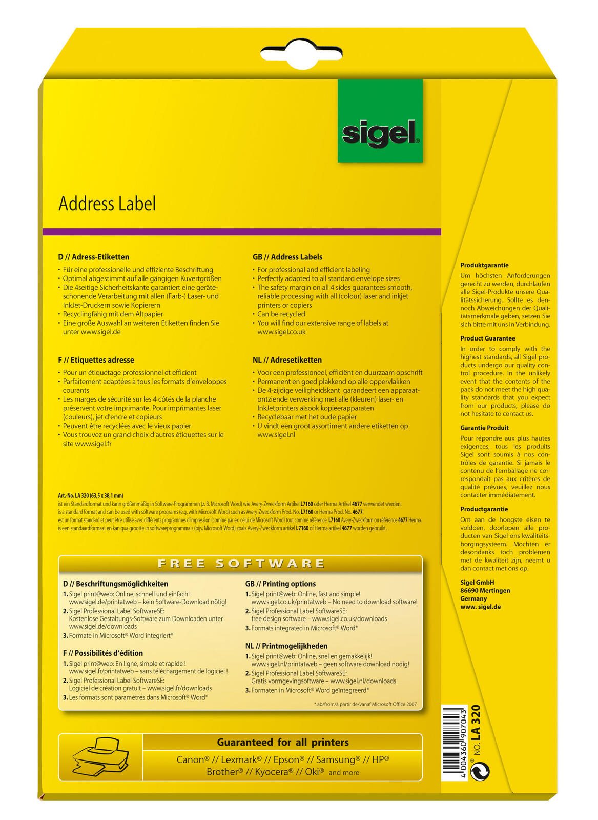 Die SIGEL Adressetiketten LA320 in der Größe 63,5 x 38,1 mm sind die ideale Lösung für all deine Etikettierungsbedürfnisse. Mit einer eleganten weißen Farbgebung bieten diese rechteckigen Etiketten nicht nur eine klare und professionelle Optik, sondern auch vielseitige Anwendungsmöglichkeiten. Die Etiketten sind aus hochwertigem, holzfreiem Papier gefertigt und verfügen über eine matte Oberfläche, die eine ausgezeichnete Druckqualität gewährleistet. In jeder Packung sind 525 selbstklebende Etiketten enthalten, die auf A4-Bögen angeordnet sind. Dies ermöglicht eine einfache Handhabung und eine problemlose Integration in deinen Arbeitsablauf. Die abgerundeten Ecken sorgen für eine ansprechende Optik und verhindern ein Abblättern der Etiketten. Dank ihrer lösemittelfreien und chlorfrei gebleichten Eigenschaften sind die SIGEL Adressetiketten nicht nur umweltfreundlich, sondern auch sicher in der Anwendung. Die SIGEL Adressetiketten sind für verschiedene Drucktechniken geeignet, darunter Kopierer, Schwarz-Weiß-Laser, InkJet und Laser. Dadurch kannst du deine Etiketten individuell gestalten und anpassen, um sie perfekt auf deine Bedürfnisse abzustimmen. Ob für den Versand, die Organisation von Dokumenten oder die Kennzeichnung von Produkten – diese Etiketten bieten dir die Flexibilität, die du benötigst. Die blickdichte Beschaffenheit der Etiketten sorgt dafür, dass der Untergrund nicht durchscheint, was besonders wichtig ist, wenn du auf farbigem oder gemustertem Papier druckst. Mit den SIGEL Adressetiketten LA320 erhältst du ein Produkt, das sowohl in der Qualität als auch in der Funktionalität überzeugt und dir hilft, deine Etikettierungsaufgaben effizient und stilvoll zu erledigen.Technische Daten