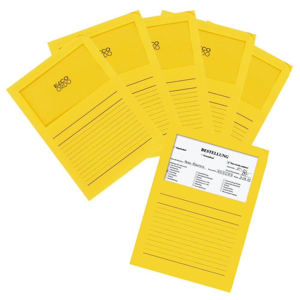 Die ELCO Sichthüllen DIN A4 glatt in intensivgelb sind die ideale Lösung für die sichere und ansprechende Präsentation deiner Dokumente. Mit einer Stärke von 120 g/qm bieten sie nicht nur eine hohe Stabilität, sondern auch eine dokumentenechte Qualität, die deine Unterlagen optimal schützt. Diese Sichthüllen sind mit einem praktischen Druck und einem Fenster ausgestattet, sodass du den Inhalt jederzeit auf einen Blick erkennen kannst. Die glatte Oberfläche der Hüllen sorgt dafür, dass deine Dokumente nicht nur gut geschützt, sondern auch stilvoll präsentiert werden. Die leuchtende gelbe Farbe zieht die Blicke auf sich und verleiht deinen Unterlagen einen frischen, modernen Look. Ob im Büro, in der Schule oder für private Zwecke, die ELCO Sichthüllen sind vielseitig einsetzbar und eignen sich hervorragend für die Organisation von wichtigen Unterlagen. Mit einer Packung von 100 Stück bist du bestens ausgestattet, um deine Dokumente ordentlich und übersichtlich zu verwahren. Die Öffnung der Hüllen erfolgt sowohl oben als auch seitlich, was dir zusätzlichen Komfort beim Einlegen und Entnehmen der Dokumente bietet. Hergestellt aus hochwertigem Papier, garantieren diese Sichthüllen Langlebigkeit und Zuverlässigkeit. Die ELCO Sichthüllen DIN A4 sind nicht nur funktional, sondern auch ein stilvolles Accessoire für jeden Arbeitsplatz. Ihr intensives Gelb macht sie zu einem echten Hingucker und sorgt dafür, dass du deine Dokumente jederzeit schnell findest. Entscheide dich für Qualität und Stil mit den ELCO Sichthüllen und bringe Ordnung in deine Unterlagen.Technische Daten