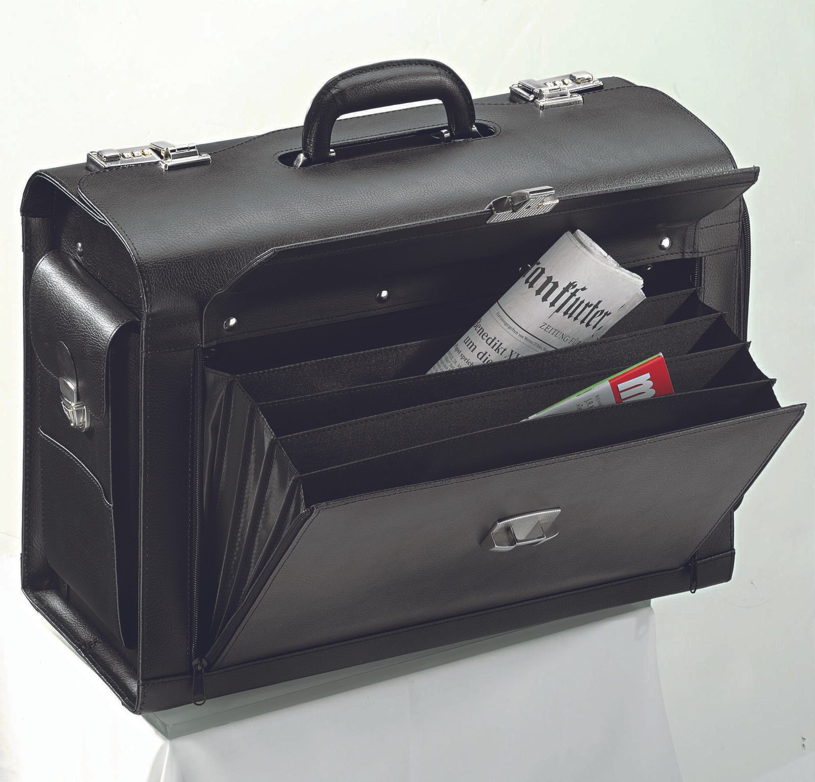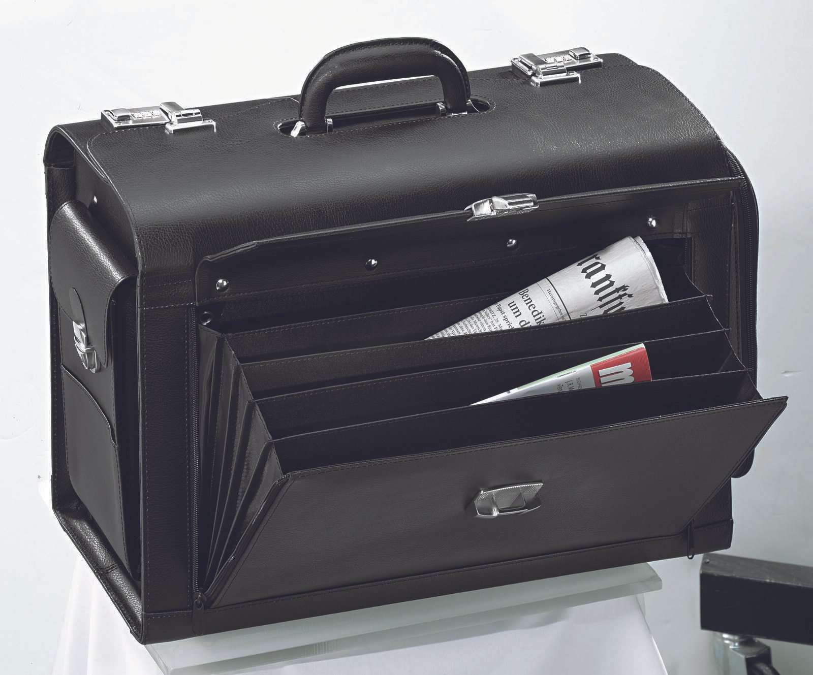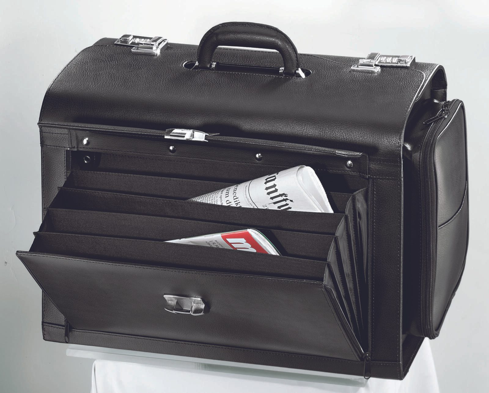 - Ausführung: eine Seitentasche abschließbar, eine Seitentasche mit Organizerfach, abschließbares Frontfach mit 5 Fächern