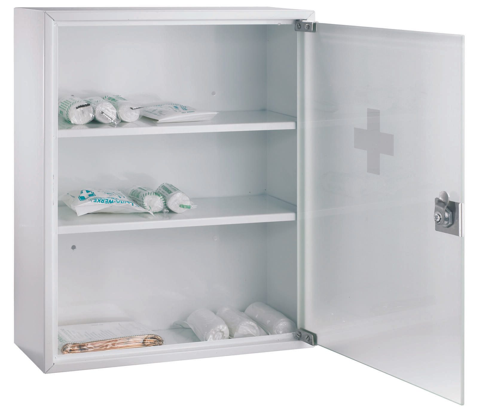 Im Inneren des Schranks sorgen zwei Fachböden für eine übersichtliche Aufteilung der Medikamente und Utensilien. Egal ob im privaten Zuhause, im Büro oder in anderen Räumlichkeiten – dieser ALCO Medizinschrank eignet sich dank seiner universalen Einsatzbereiche ideal für verschiedene Umgebungen.