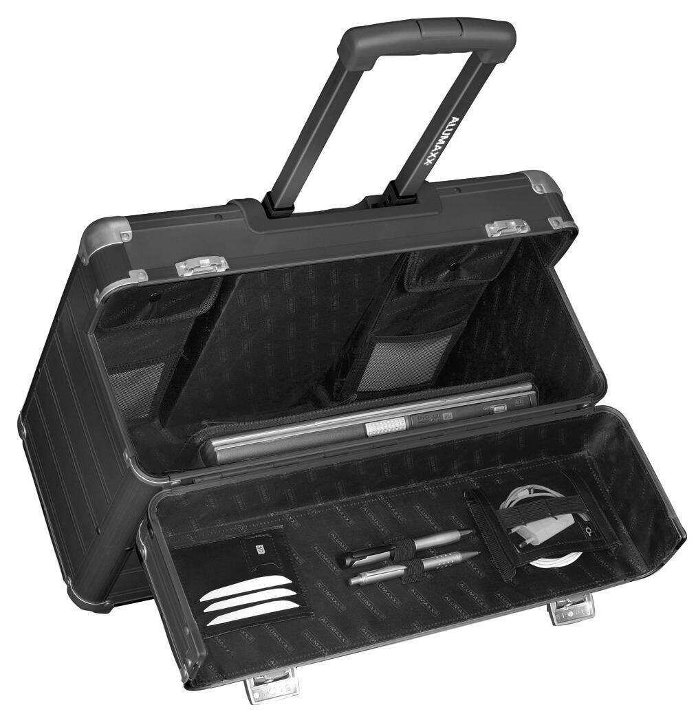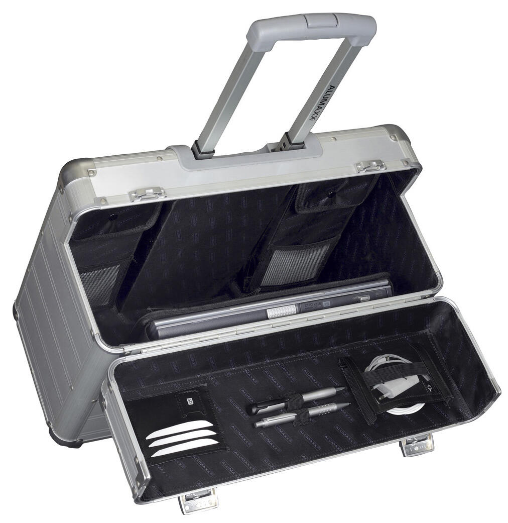 Der ALUMAXX Pilotenkoffer DISCOVERY in elegantem silber matt ist die perfekte Lösung für alle, die viel unterwegs sind und dabei Wert auf Stil und Funktionalität legen. Mit einem Außenmaß von 47,5 x 22,5 x 38,5 cm und einem Innenmaß von 46 x 21 x 35,5 cm bietet dieser Koffer ausreichend Platz für Notebooks bis zu 39,6 cm (15,6 Zoll) sowie für wichtige Unterlagen und Zubehör. Die durchdachte Inneneinteilung des Koffers umfasst zwei herausnehmbare Organizertaschen, ein herausnehmbares Inlay mit Netzfach, drei Visitenkartenfächer, ein SD-Kartenfach sowie ein Netzfach mit drei Schlaufen für USB-Sticks und Kabel. So hast du alles stets griffbereit und gut organisiert. Besonders hervorzuheben ist der ergonomische Tragegriff, der einen komfortablen Transport ermöglicht. Die verstärkten Kanten sorgen für zusätzliche Stabilität und Langlebigkeit, während das sichere Schloss-System mit Zweifachschließung und Öffnungsautomatik inklusive Schlüssel für den nötigen Schutz deiner Wertsachen sorgt. Die gummierten Leichtlaufrollen garantieren ein müheloses Manövrieren, egal ob auf dem Weg zum nächsten Meeting oder beim Reisen. Das Material aus hochwertigem Aluminium verleiht dem Koffer nicht nur eine edle Optik, sondern macht ihn auch robust und widerstandsfähig. Der ALUMAXX Pilotenkoffer DISCOVERY ist somit nicht nur ein praktischer Begleiter für Beruf und Freizeit, sondern auch ein stilvolles Accessoire, das deine Professionalität unterstreicht.Technische Daten