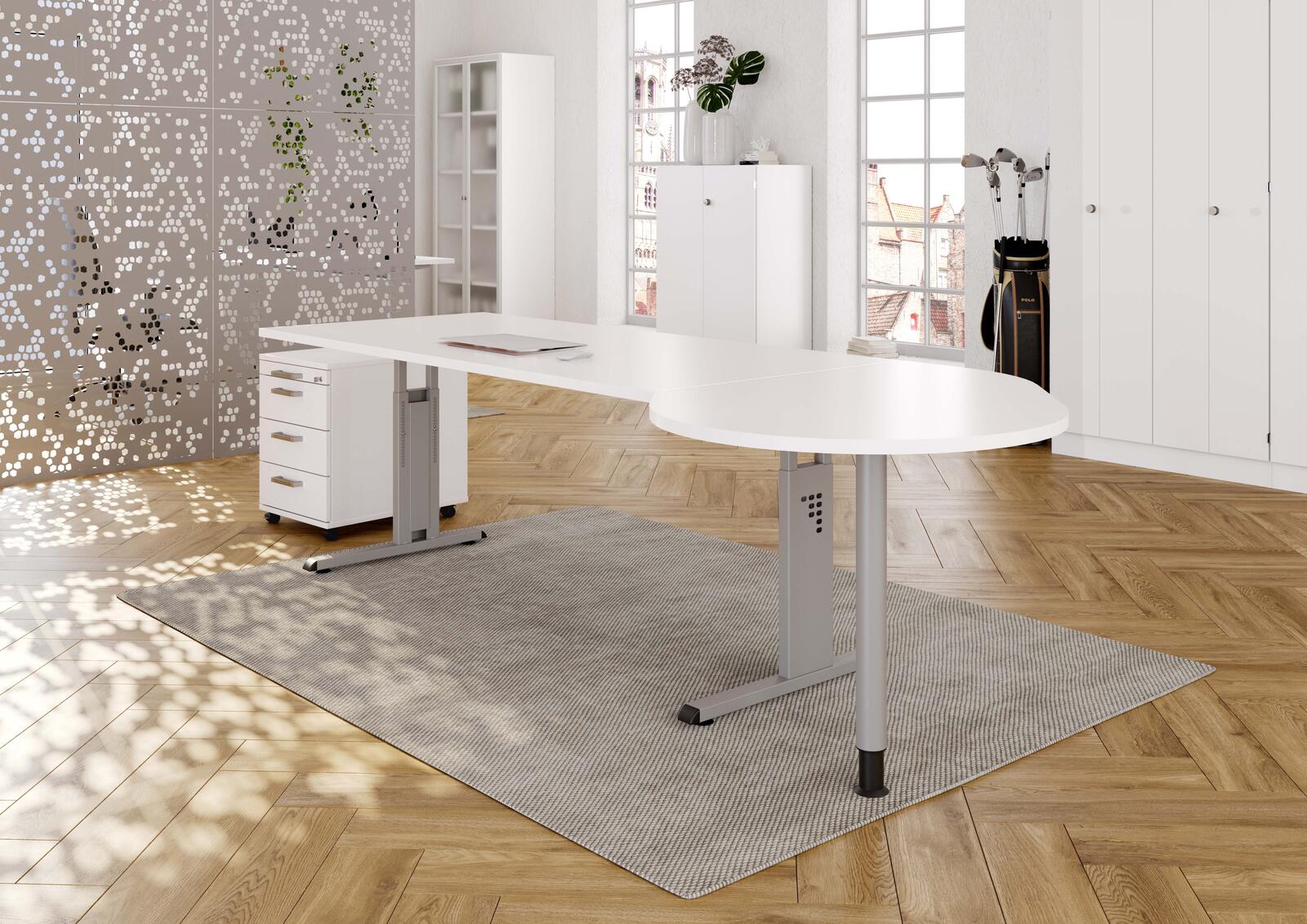 Der HAMMERBACHER Anbautisch höhenverstellbar VLA81/W/S in elegantem Weiß vereint Funktionalität und modernes Design. Dieser Anbautisch ist ideal für die Hammerbacher Schreibtischserie OS, FS, US, ZS, AS und YS und bietet eine perfekte Ergänzung zu deinem Arbeitsplatz. Mit einer großzügigen Fläche von 103 cm x 80 cm ermöglicht er ausreichend Platz für deine Unterlagen, Laptops oder andere Arbeitsmaterialien. Die Tischplatte besteht aus robuster Spanplatte, die nicht nur langlebig, sondern auch pflegeleicht ist. Der stilvolle silberne Rahmen aus hochwertigem Stahl sorgt für eine stabile Konstruktion und verleiht dem Tisch eine ansprechende Optik. Die Kombination aus weißer Tischplatte und silbernem Gestell passt harmonisch in jede Büroumgebung und schafft eine angenehme Arbeitsatmosphäre. Ein besonderes Highlight des HAMMERBACHER Anbautisches ist die Höhenverstellbarkeit, die dir die Möglichkeit bietet, die Tischhöhe individuell anzupassen. Dies fördert eine ergonomische Arbeitsweise und sorgt dafür, dass du stets in einer bequemen Position arbeiten kannst, egal ob im Sitzen oder Stehen. Die Tropfenform des Tisches trägt nicht nur zur ästhetischen Gestaltung bei, sondern ermöglicht auch eine flexible Anordnung im Raum. Der Anbautisch ist somit nicht nur funktional, sondern auch ein stilvolles Möbelstück, das deinem Arbeitsplatz einen modernen Touch verleiht. Mit dem HAMMERBACHER Anbautisch VLA81/W/S triffst du eine ausgezeichnete Wahl für ein effizientes und ansprechendes Arbeitsumfeld.Technische Daten