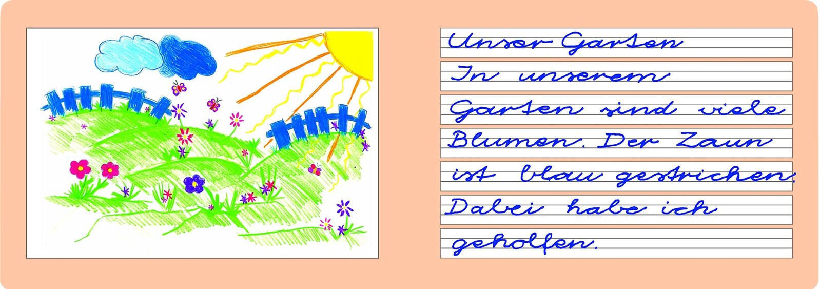 Die orangefarbene und weiße Papierfarbe sorgt für eine angenehme Schreiberfahrung, während das Heft ohne Rand gestaltet ist, was mehr Platz zum Schreiben und Üben bietet. Die Lineatur des Hefts ist speziell für Schreibanfänger konzipiert und hilft beim Erwerb der grundlegenden Schreibtechniken.