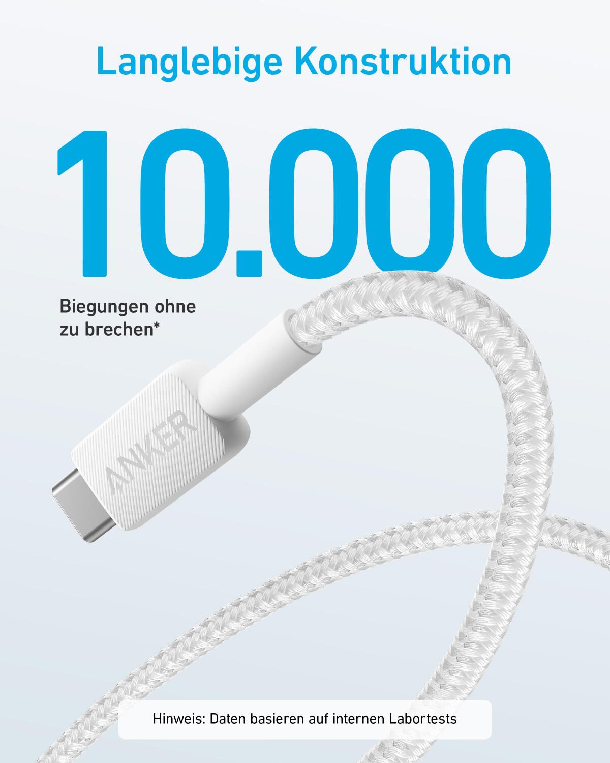 Das Kabel ist so konstruiert, dass es bis zu 10.000 Biegungenaushält, und ist damit bereit für jedes Abenteuer.