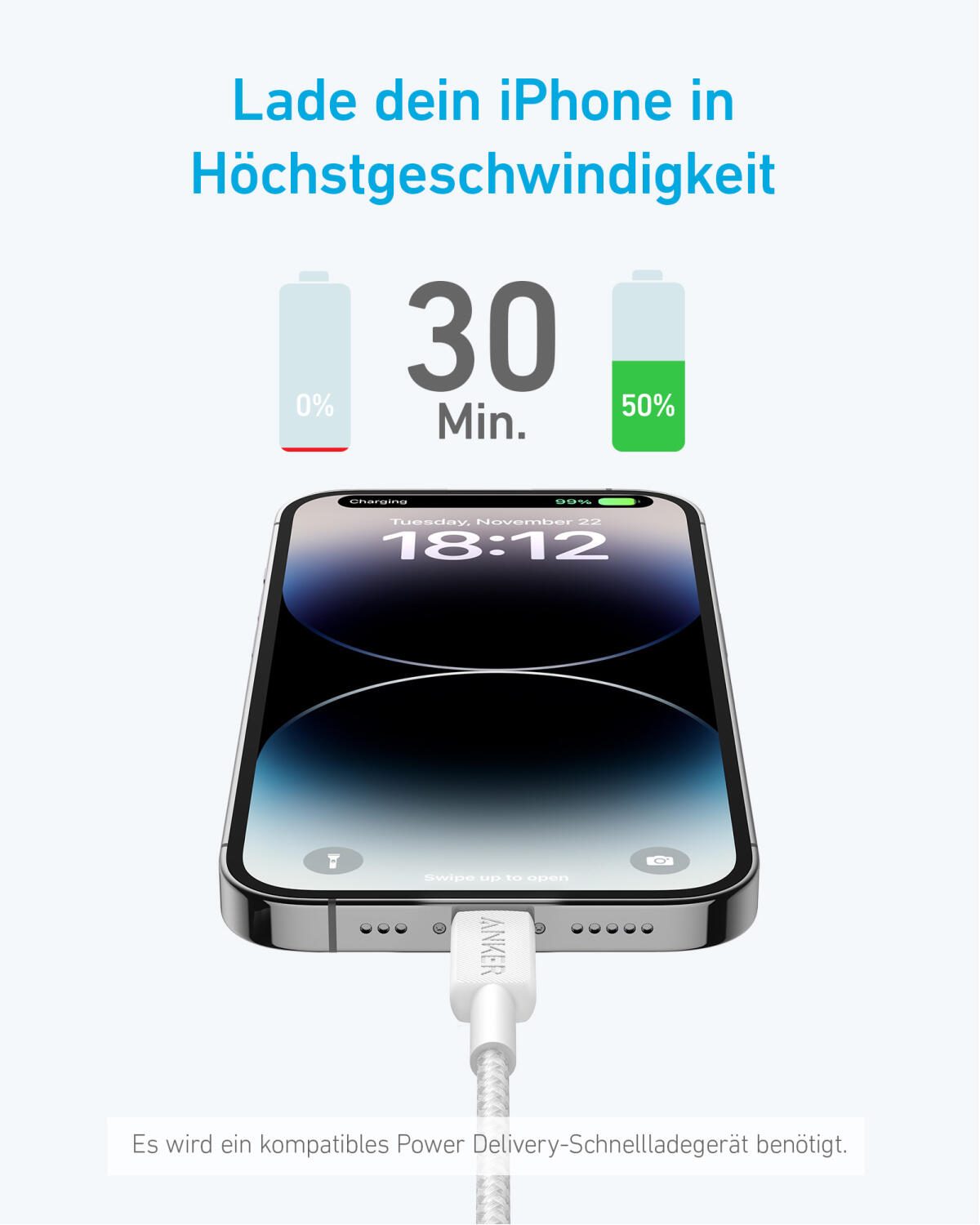 Lade dein iPhone in nur 30 Minuten auf 50% Akku, wenn du ein kompatibles Power Delivery USBC Ladegerät verwendest (separat erhältlich).