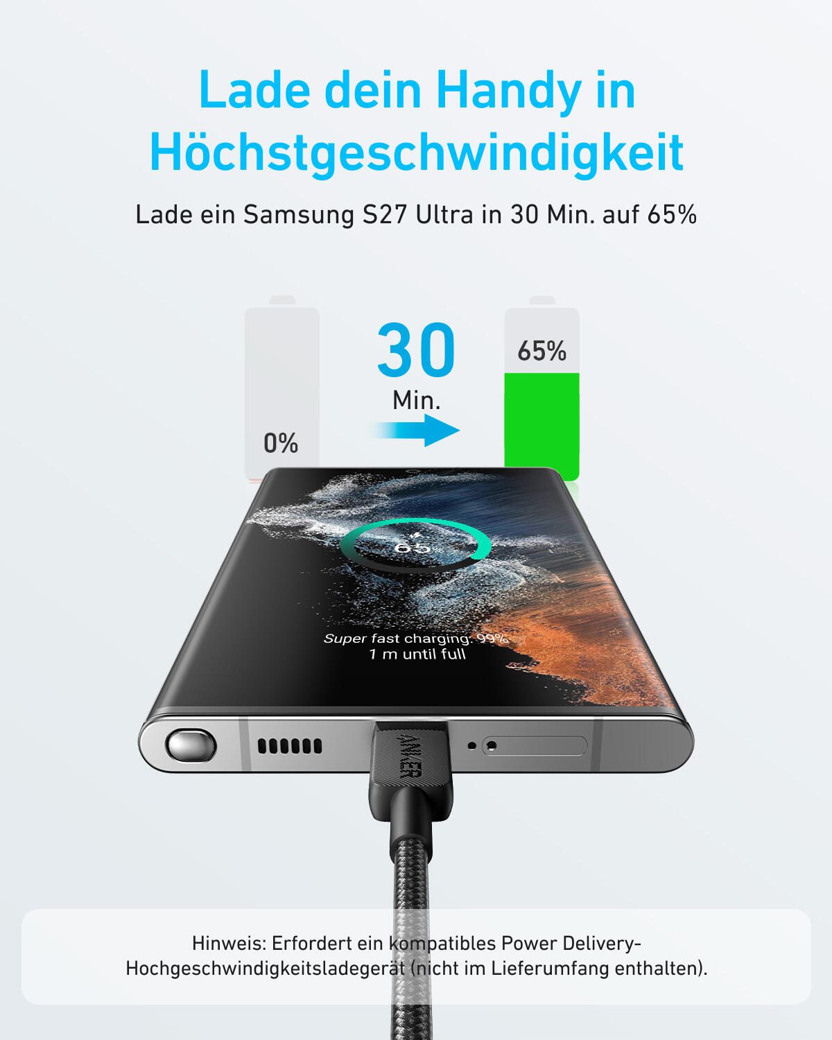 Lade dein Samsung Galaxy S22 Ultra in nur 30 Minuten auf 65% Akku auf, wenn du ein kompatibles Power Delivery USB-C Ladegerät verwendest (nicht im Lieferumfang enthalten).