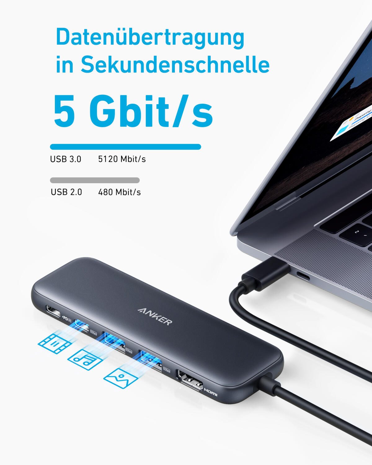 Verwandle einen deiner USB-C-Ports in 5 Anschlüsse, damit du Daten in Sekundenschnelle übertragen, Medien in unübertroffener Klarheit streamen, schnelles Pass-Through Aufladen und vieles mehr genießen kannst.