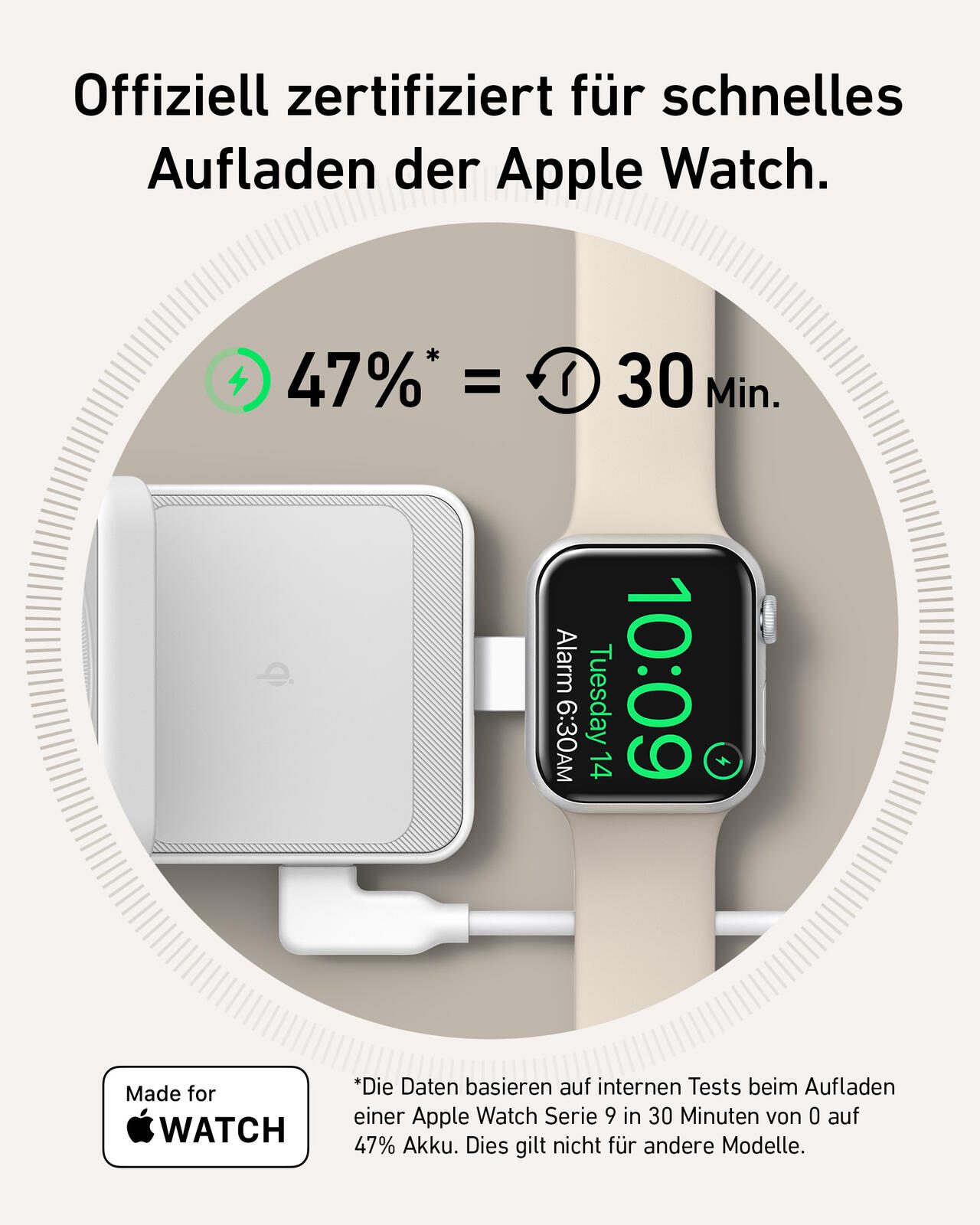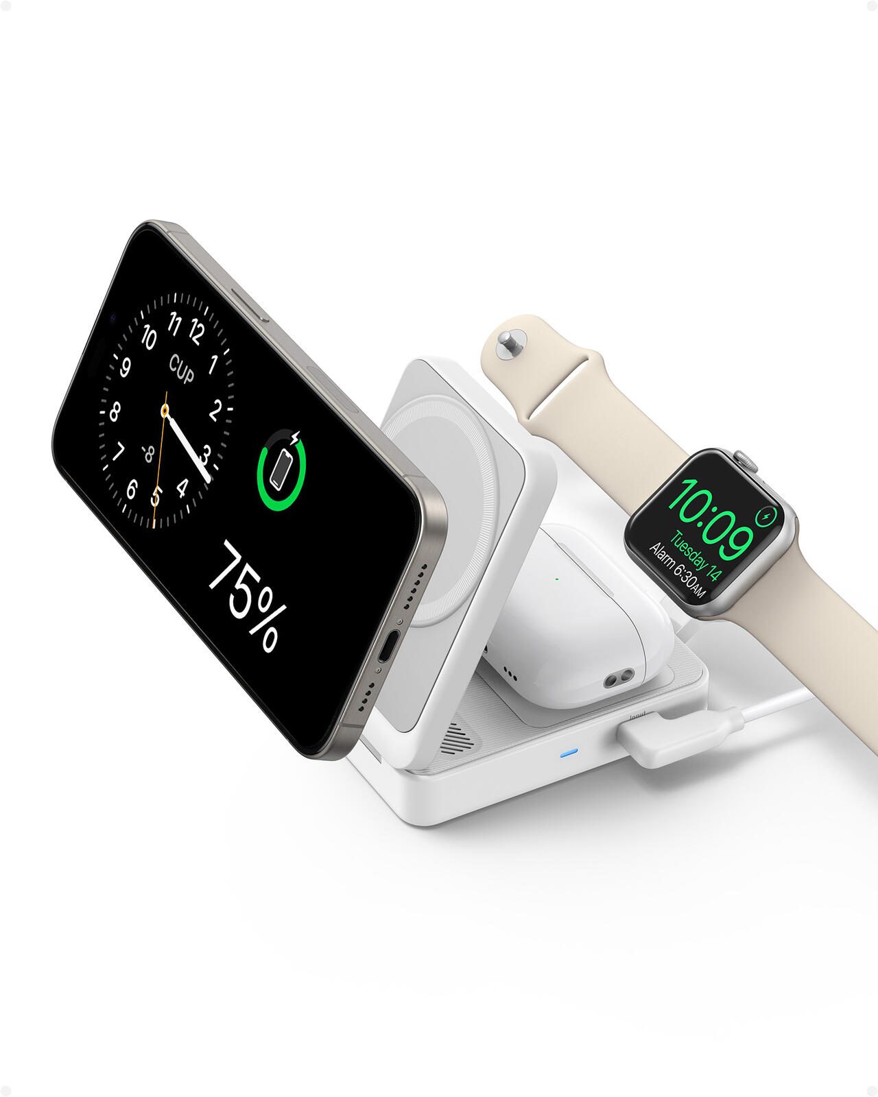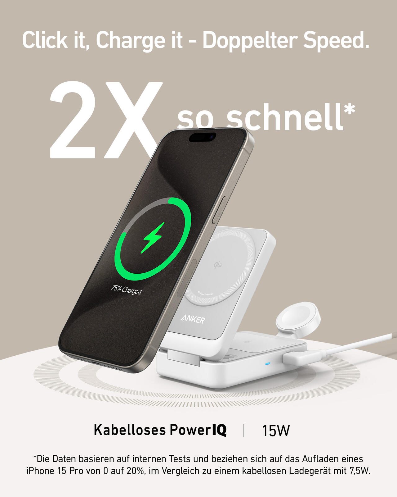 Die neue Ultra-Schnellladung von Anker in Kombination mit Qi2-Technologie gewährleistet, dass diese zusammenklappbare 3-in-1-Ladestation deine Essentials schneller auflädt, wenn du es dringend brauchst.