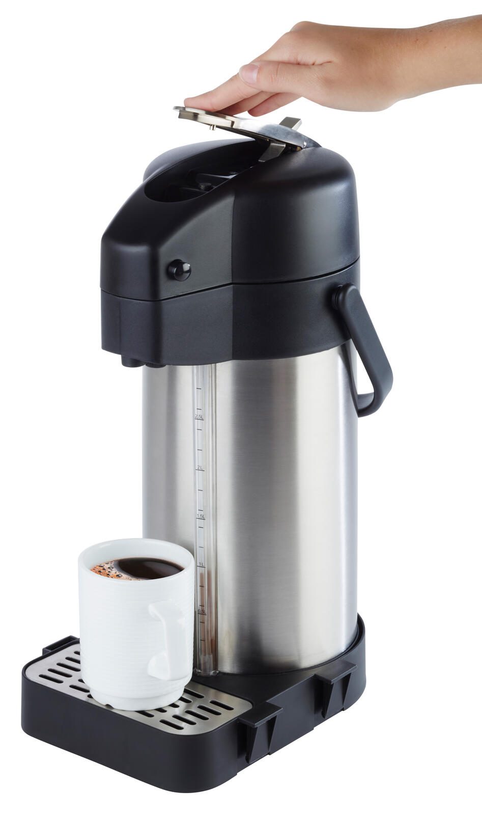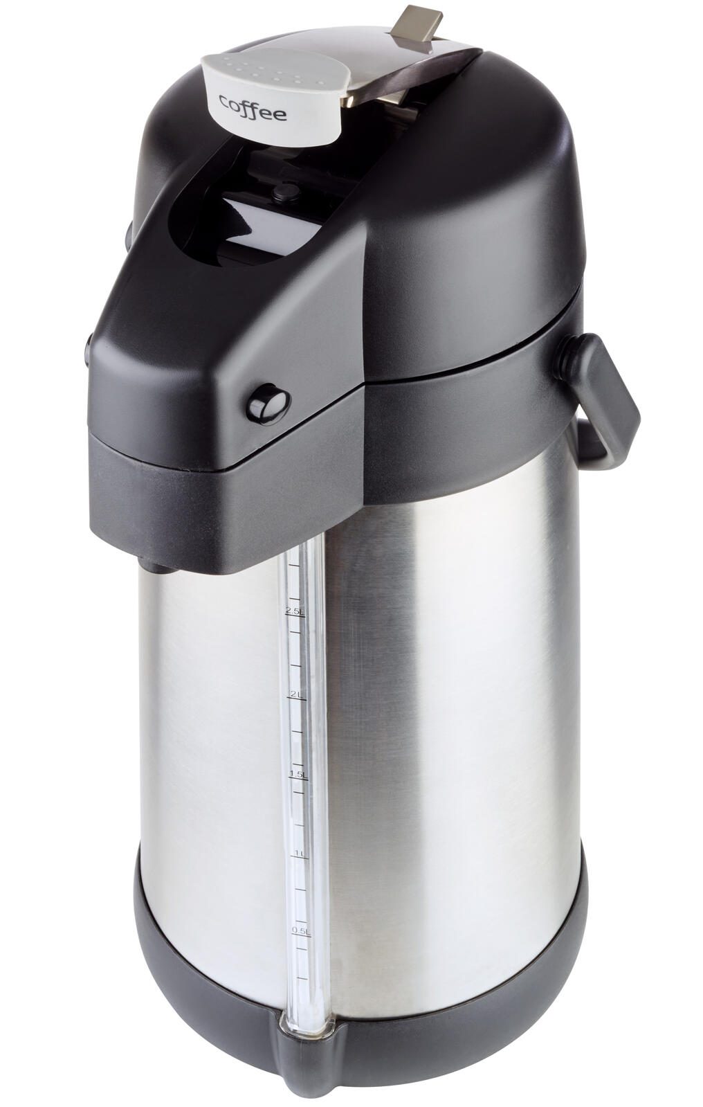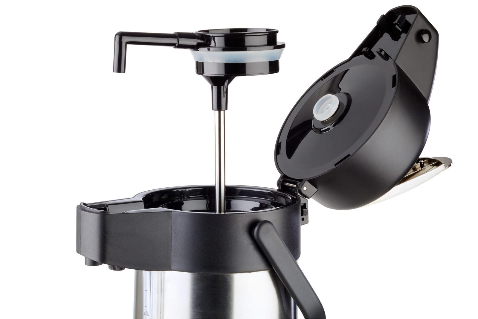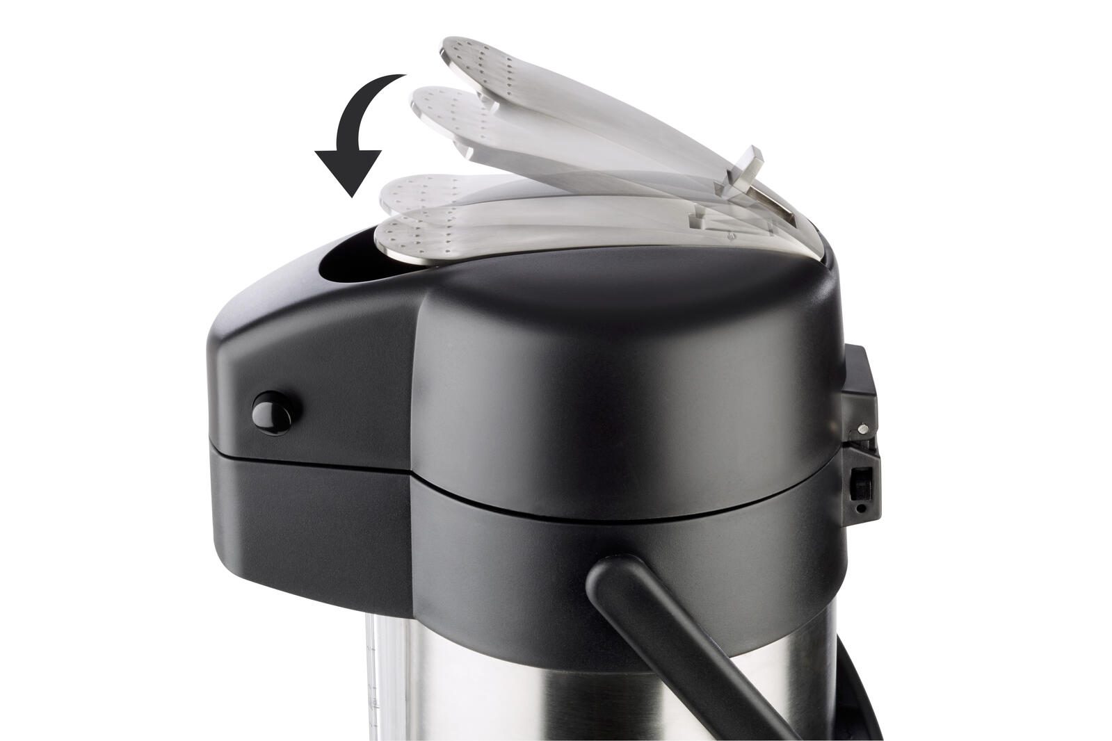 - Füllstandsanzeige, mit 4 unterschiedlichen Inhaltsbeschriftungen für den Pumphebel (coffee, tea, hot water, decaf), aufgeklappt passt die Kanne unter die gängigen Kaffeeau