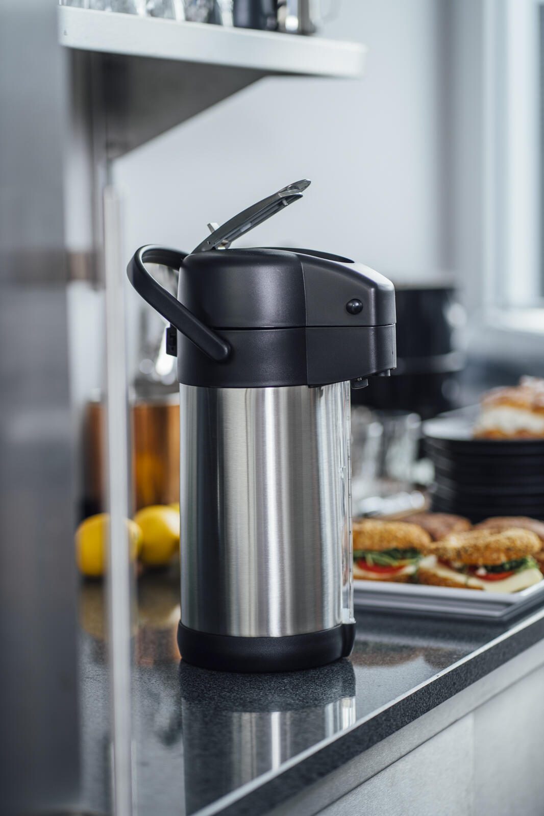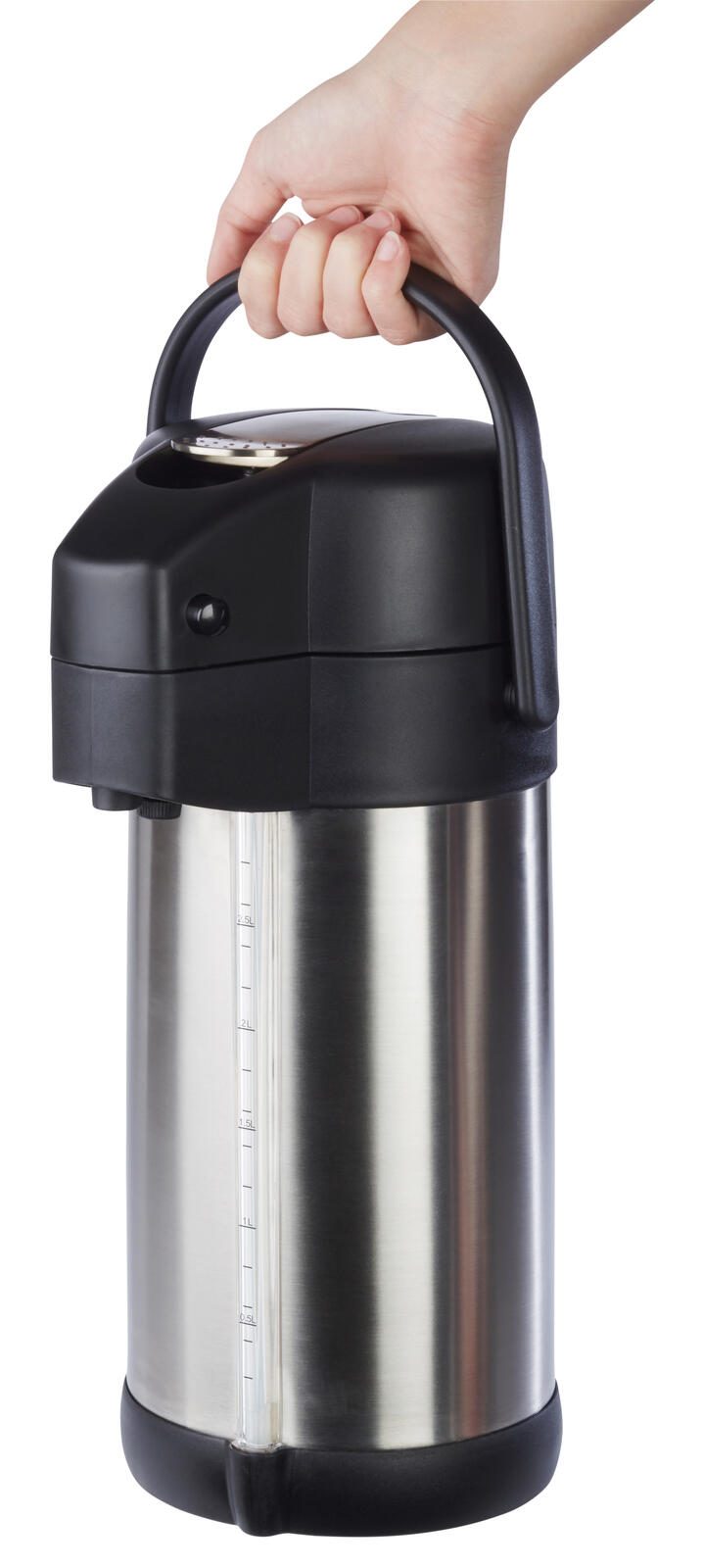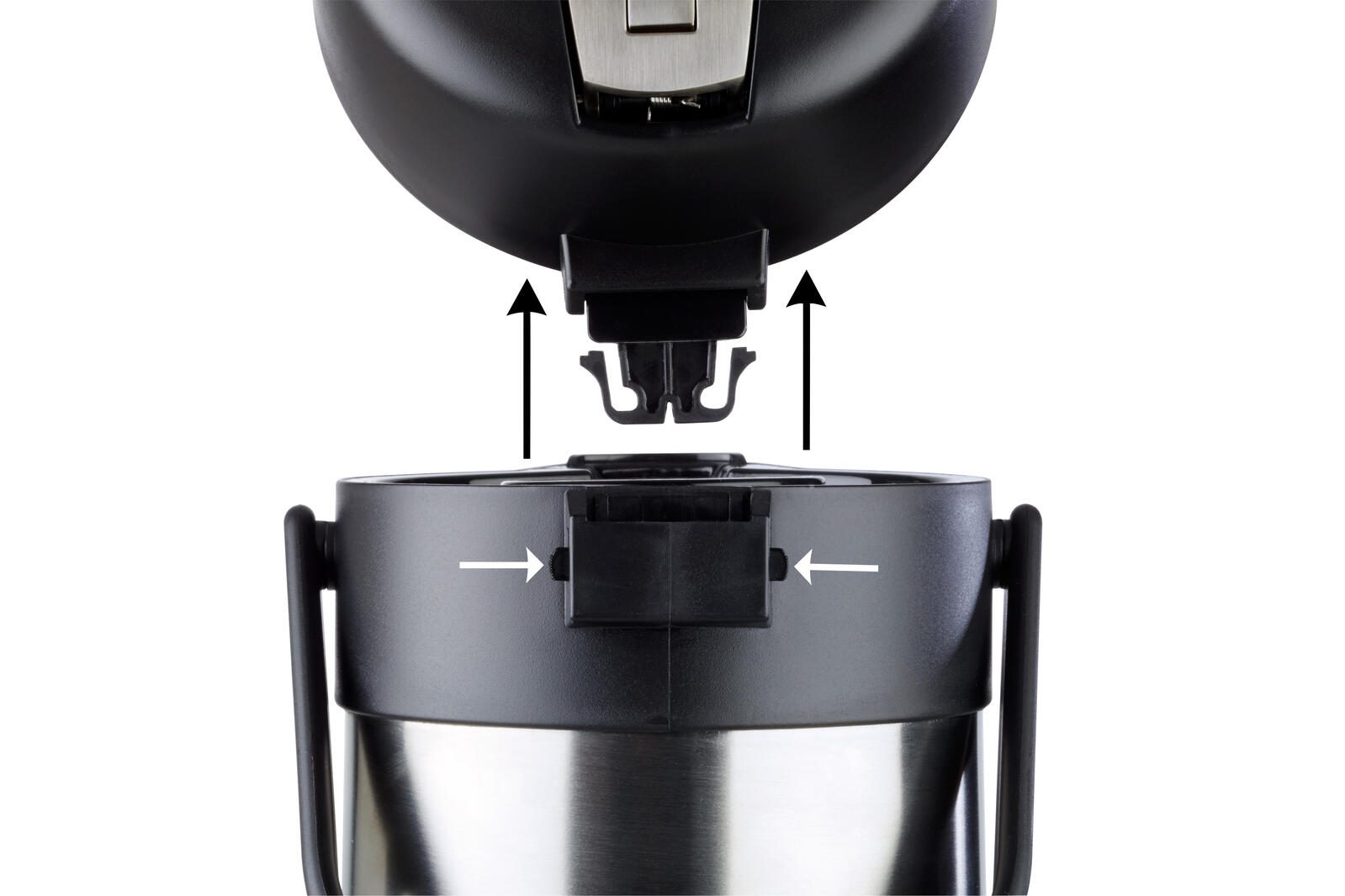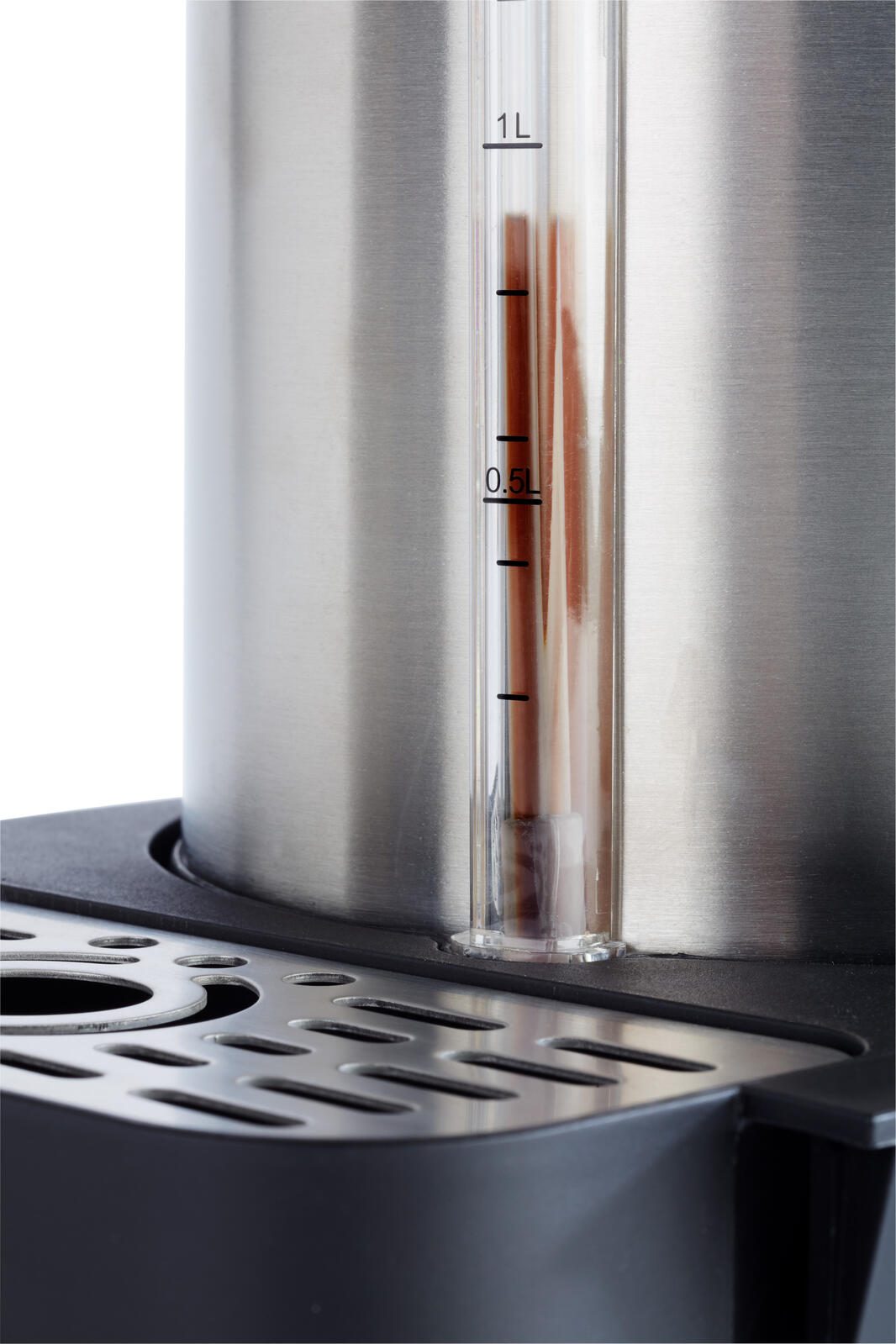 - Füllstandsanzeige, mit 4 unterschiedlichen Inhaltsbeschriftungen für den Pumphebel (coffee, tea, hot water, decaf), aufgeklappt passt die Kanne unter die gängigen Kaffeeau
