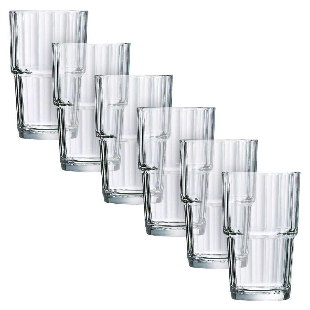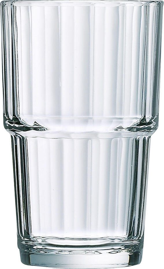 Das Material Glas sorgt für eine klare Optik und eine angenehme Haptik. Zudem ist der Becher spülmaschinenfest, was die Reinigung besonders einfach und komfortabel macht. Der Stapelbecher ist Teil der Serie Norvege FH27 und wird in Packungen zu je 6 Stück geliefert.