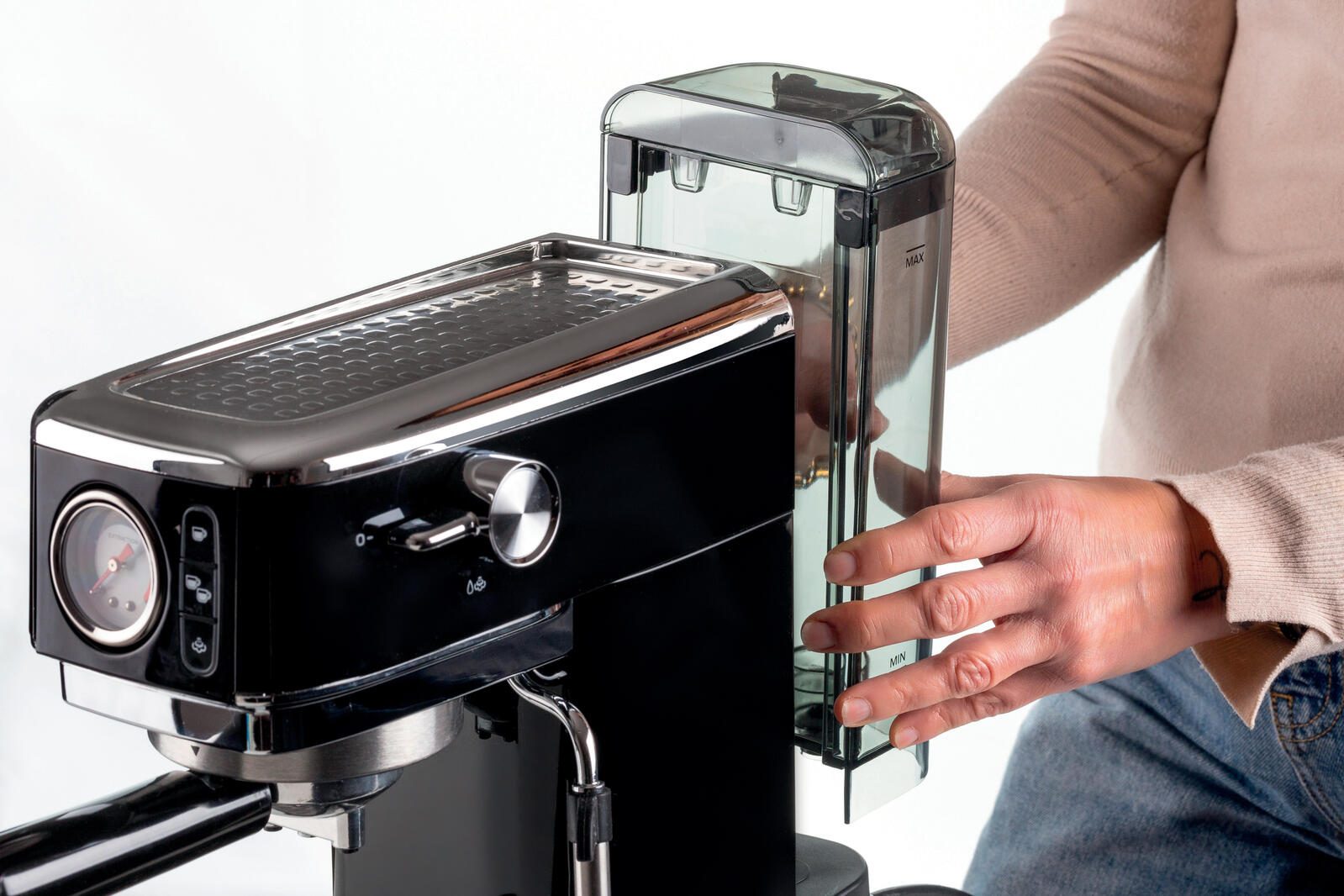 - Bedienung: Tasten, Wasserstandanzeige, rutschfeste Füße, 15 bar, Milchsystem