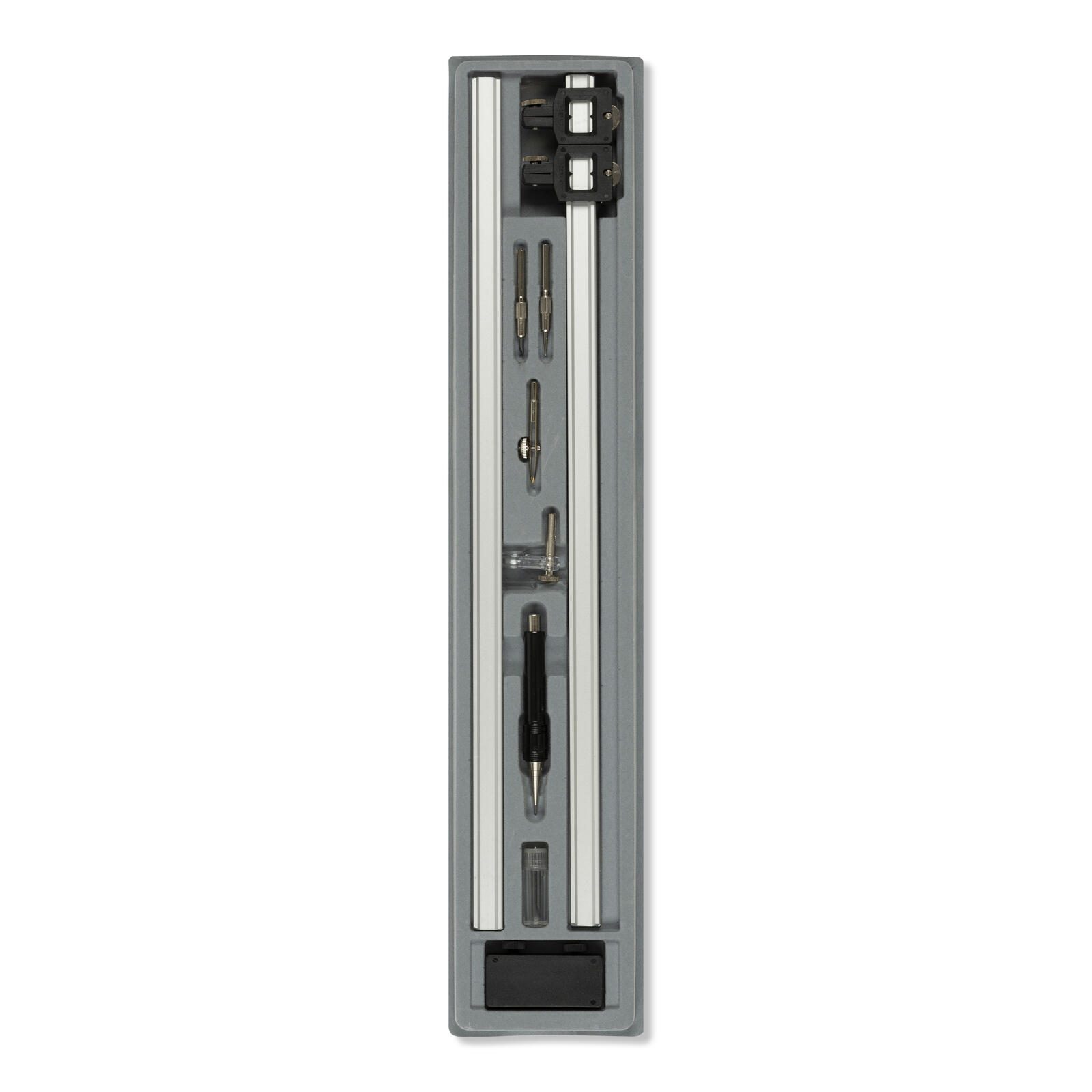 - Lieferung inkl.: 2 Alu-Profilstangen á 330 mm, 2 Läufer mit Aufnahmebohrung 3,5 mm. Kupplung für die Profilstangen, Zirkelansatz 3,5 mm, Feinminen-Bleieinsatz 0,5 mm, Blei-, Nadel-, Reißfedereinsatz und Minenbüchse