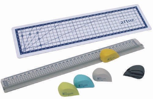 - Besonderheiten: 1 Lineal, 1 Schneideunterlage, je 1 Rollschneider mit Glattschnitt, Perforierschnitt, Faltenschnitt, Zickzackschnitt und Wellenschnitt.