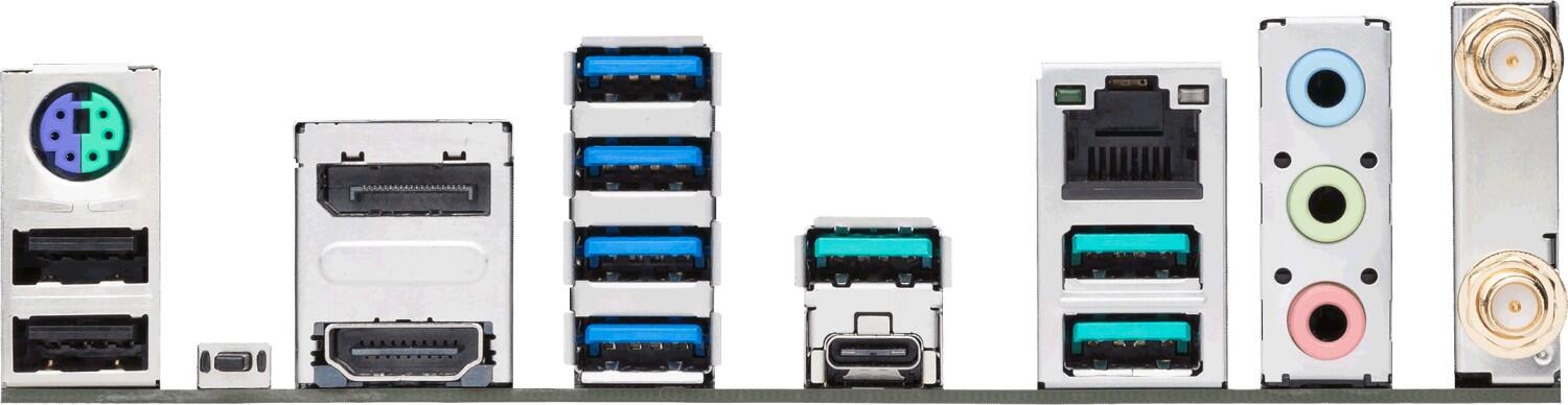 1 x HDMI 1 x DisplayPort 1 x USB-C 3.2 Gen2x2 3 x USB 3.2 Gen 2 4 x USB 3.2 Gen 1 2 x USB 2.0 1 x LAN (2.5Gigabit Ethernet) 1 x Audio Line-In - Mini-Klinkenstecker 1 x Mikrofon - Mini-Klinkenstecker 1 x Audio Line-Out - Mini-Klinkenstecker PS/2-Tastatur/-maus 2 x Antenne