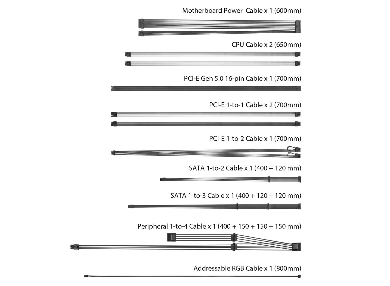 Lieferumfang: "Power Cord x 1 Motherboard Power Cable x 1 (600mm) CPU Cable x 2 (650mm) PCI-E Gen 5 16-pin Cable x 1 (700mm) PCI-E 1-to-1 Cable x 2 (700mm) PCI-E 1-to-2 Cable x 1 (700mm) SATA 1-to-2 Cable x 1 (400+120mm) SATA 1-to-3 Cable x 1 (400+120+120mm) Peripheral