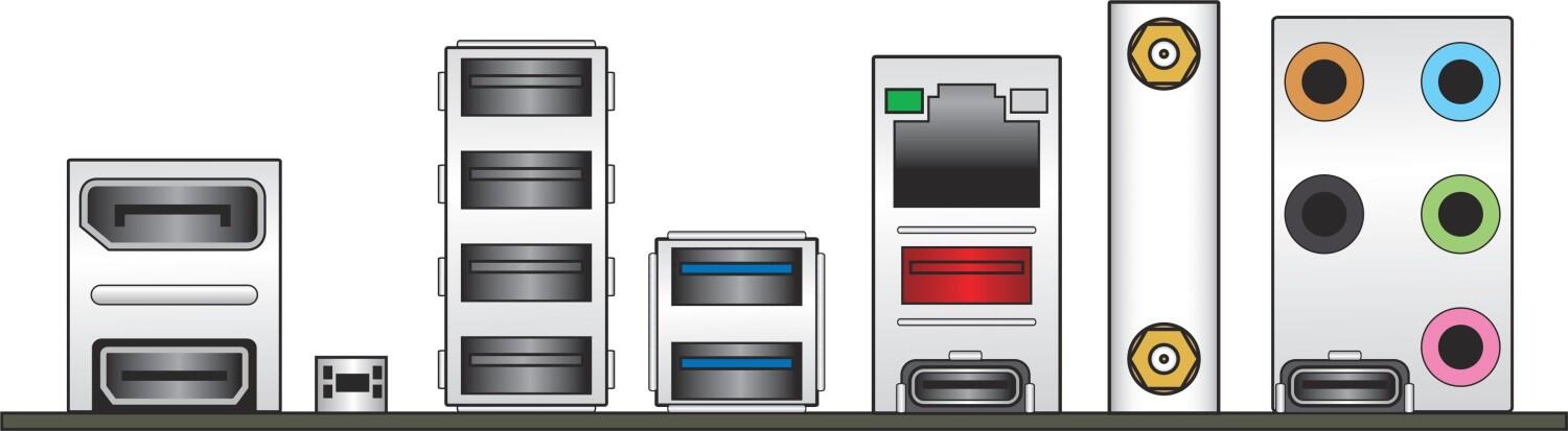 - LAN, USB, HDMI, DisplayPort, WLAN, Bluetooth, I/O-Blende integriert