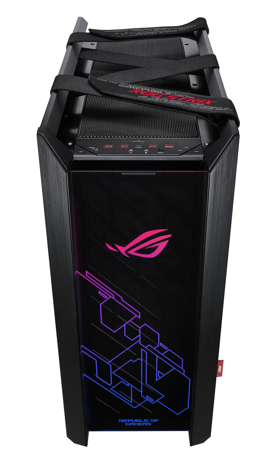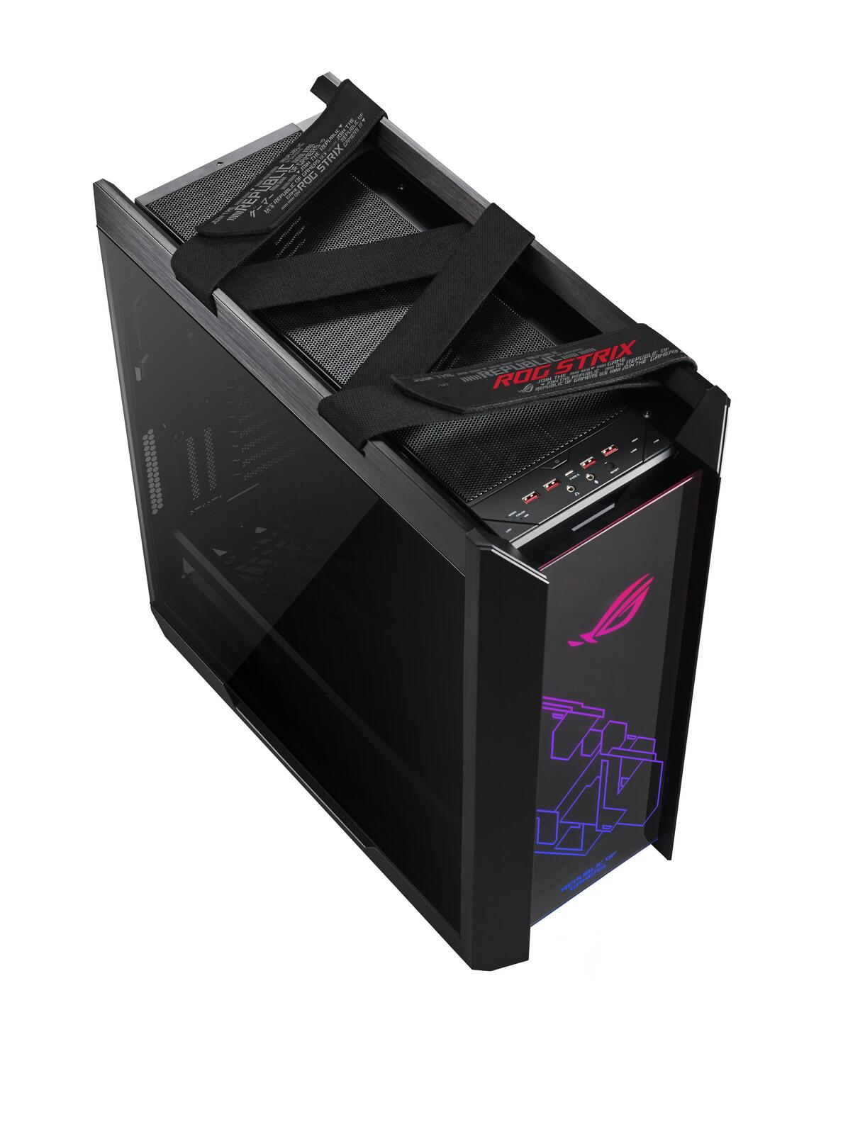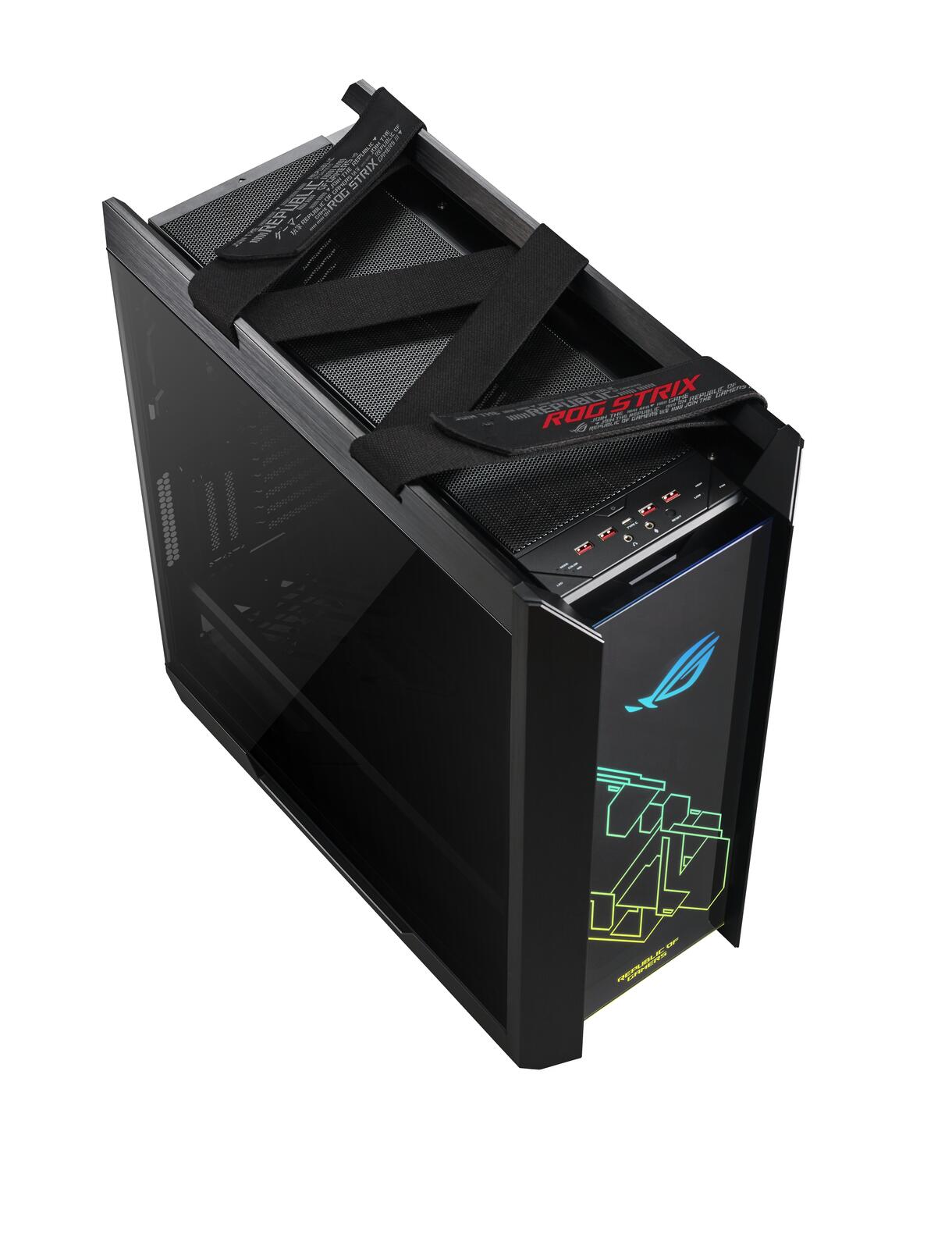 Die Anschlussblende ist vollgepackt mit Schnittstellen, darunter auch ein reversibler USB-3.1-Typ-C™-Anschluss. Zusätzlich sind spezielle Lüfterdrehzahl- und RGB-Beleuchtungssteuerungen vorhanden, um die Einstellungen in Echtzeit vorzunehmen.Praktische Tragegriffe am Gehäuse