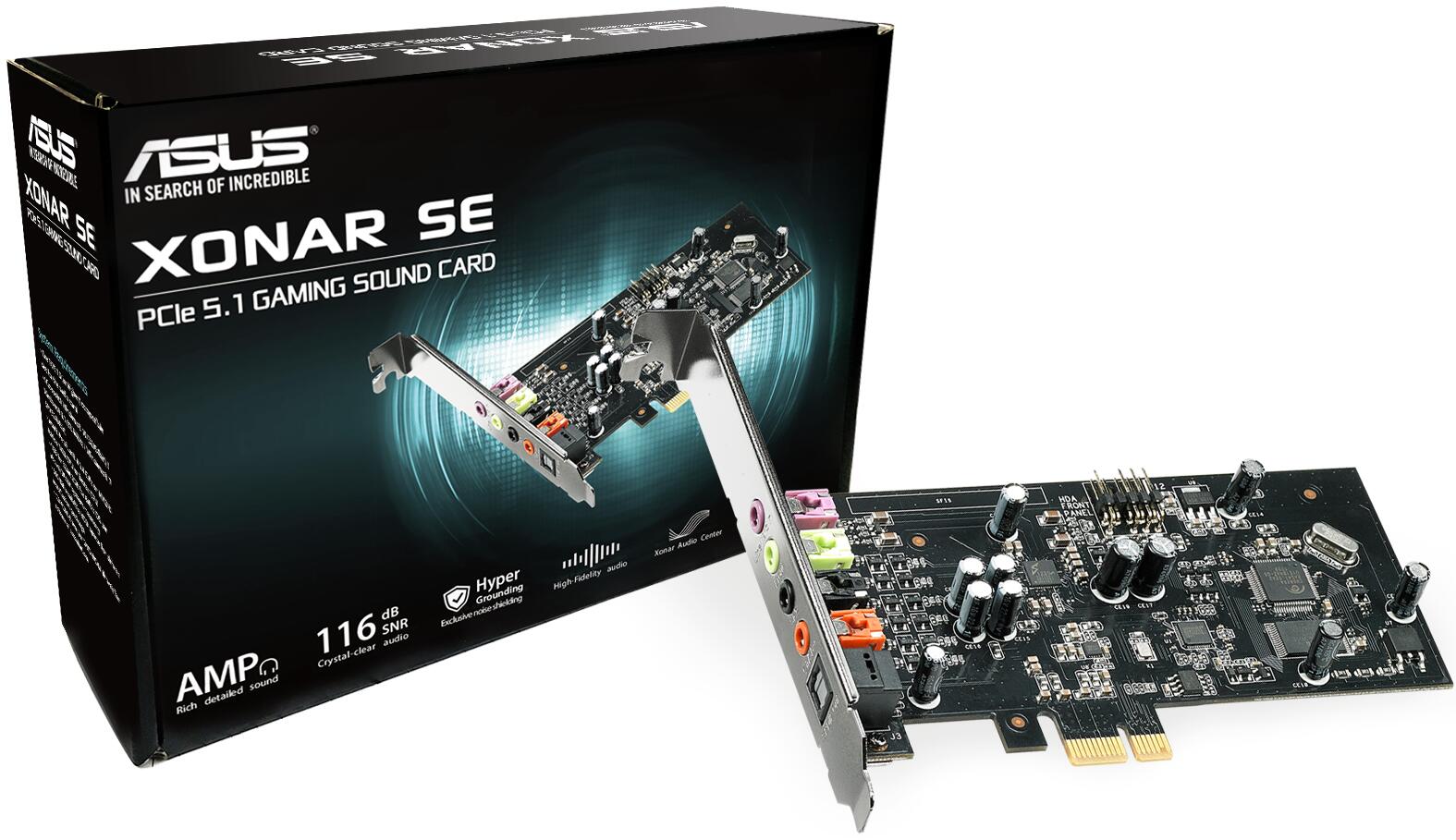 Die Xonar SE ist eine PCIe-Gaming-Soundkarte mit hochwertigen Komponenten. Sie wurde entwickelt, um Spielern mit außergewöhnlichen Ansprüchen an die Soundqualität ein optimales Gaming- und Multimedia-Erlebnis zu bieten. Die Xonar SE liefert 5.1-Kanal-Ton mit hochauflösendem Klang in 192kHz/24-Bit und einem Signal-Rauschabstand (SNR) von 116dB. Zusätzlich bietet sie einen integrierten 300-Ohm-Kopfhörerverstärker, der für einen kräftigen, detaillierten Sound und definierten Bass sorgt.
