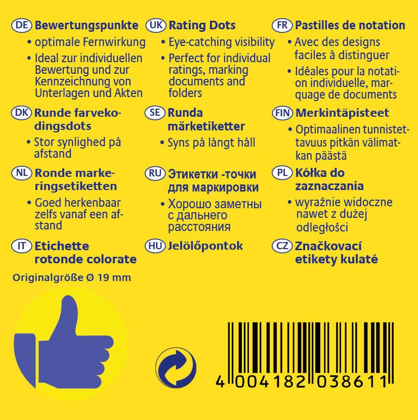 Die AVERY Zweckform Bewertungspunkte Daumen sind die perfekte Lösung für alle, die ihre Bewertungen und Rückmeldungen auf einfache und effektive Weise visualisieren möchten. Mit einer praktischen Rolle, die 250 selbstklebende, runde Etiketten enthält, bieten diese Bewertungspunkte eine ausgezeichnete Möglichkeit, um Ihre Meinungen und Einschätzungen klar und ansprechend zu kommunizieren.