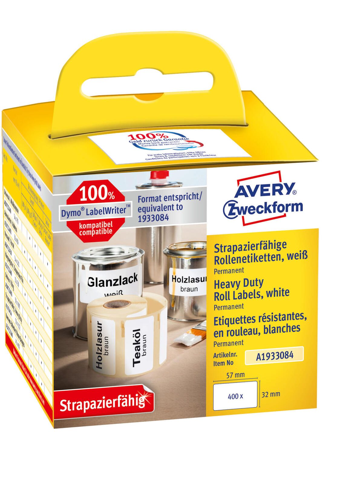 Die Hochleistungs-Vielzweck-Etiketten von AVERY Zweckform sind die ideale Lösung für all deine Beschriftungsbedürfnisse. Diese selbstklebenden Etiketten sind speziell für DYMO Etikettendrucker konzipiert und bieten dir eine herausragende Qualität und Vielseitigkeit. Mit einem Pack von 400 Etiketten bist du bestens ausgestattet, um deine Projekte effizient und professionell zu gestalten. Die Etiketten zeichnen sich durch ihre wasserfesten, schmutzbeständigen und temperaturbeständigen Eigenschaften aus. Egal, ob du sie für den Innen- oder Außenbereich verwendest, sie halten extremen Bedingungen stand. Zudem sind sie reinigungsmittelbeständig, was bedeutet, dass du sie problemlos in Bereichen einsetzen kannst, in denen Hygiene und Sauberkeit oberste Priorität haben. Die rechteckige Form der Etiketten (32x57 mm) ermöglicht eine klare und präzise Beschriftung, die sich perfekt für raue Oberflächen eignet. Ob für das Beschriften von Ordnern, Produkten oder anderen Objekten – diese Etiketten bieten dir die Flexibilität, die du benötigst. Sie sind kompatibel mit den DYMO LabelWriter Modellen 330T sowie der 400- und 450-Serie, einschließlich der Wireless-Varianten, was die Anwendung noch einfacher und effizienter gestaltet. Die Hochleistungs-Vielzweck-Etiketten in klassischem Weiß sorgen für eine klare Lesbarkeit und eine ansprechende Optik. Durch ihre hohe Qualität und Langlebigkeit sind sie die perfekte Wahl für alle, die Wert auf zuverlässige und anpassungsfähige Etikettierung legen. Vertraue auf die Expertise von AVERY Zweckform und erlebe, wie diese Etiketten deine Organisation und Beschriftung auf ein neues Level heben.Technische Daten