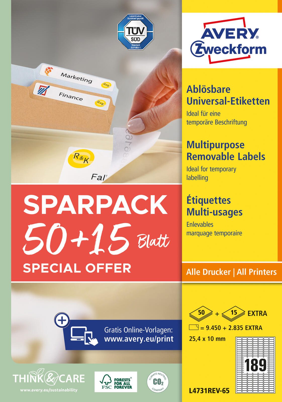 In einer Packung befinden sich insgesamt 12.285 Etiketten, verteilt auf 65 A4-Bögen. Diese hohe Anzahl ermöglicht eine umfangreiche Nutzung, beispielsweise im Büro oder für private Zwecke. Die Etiketten sind ablösbar, was eine rückstandsfreie Entfernung ermöglicht und so die Wiederverwendung von Oberflächen erleichtert.