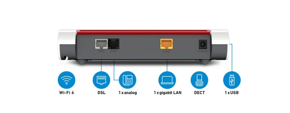 - 1 x a/b-Port (wahlweise TAE oder RJ11) für analoges Telefon, Anrufbeantworter oder Fax