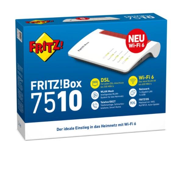 Die FRITZ!Box 7510 ist die clevere und energieeffiziente Zentrale für Ihr Heimnetz: Sie ist konzipiert für DSL-Anschlüsse bis zu 300 MBit/s und liefert zuverlässiges WLAN nach dem neuesten Standard Wi-Fi 6 im reichweitenstarken 2,4-GHz-Band.