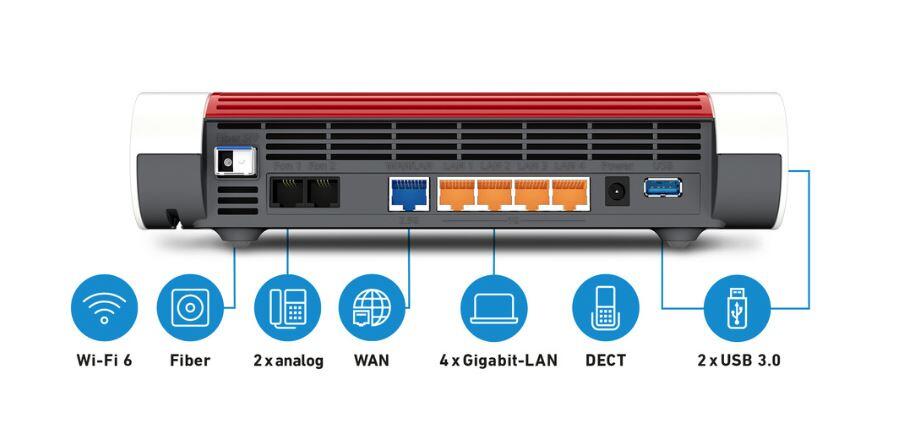 LAN: 4 x 10Base-T/100Base-TX/1000Base-T - RJ-45 WAN: 1 x 2.5GBase-T - RJ-45 WAN: 1 x AON/GPON/XGS-PON - SFP (mini-GBIC) Telefonleitung: 2 x RJ-11 USB 3.0: 2 x