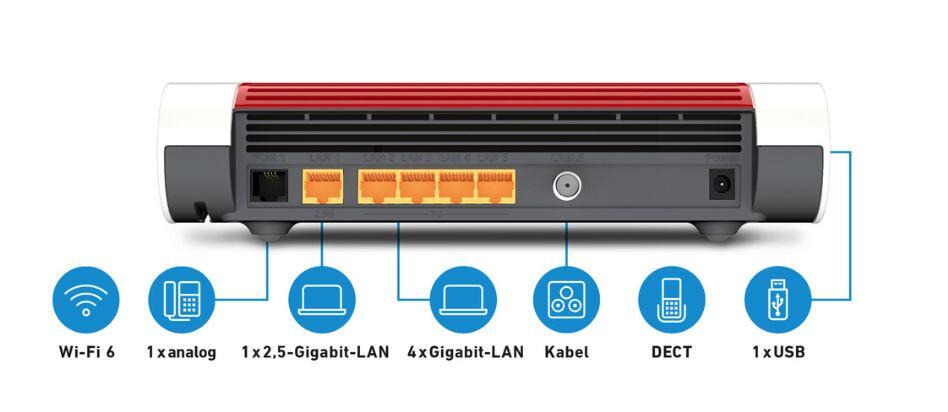 Das leistungsstarke DOCSIS 3.1 Kabelmodem bietet bis zu 6 Gbit/s Downstream-Geschwindigkeit und ist abwärtskompatibel zu EuroDOCSIS 3.0. Schnelles WLAN AX (Wi-Fi 6) ermöglicht all Ihren Multimediageräten den drahtlosen Internetzugang. Ein 2,5-Gigabit-LAN-Anschluss, vier 1-Gigabit-LAN-Anschlüsse und eine leistungsstarke Telefonanlage mit vielen Funktionen runden die Ausstattung ab.