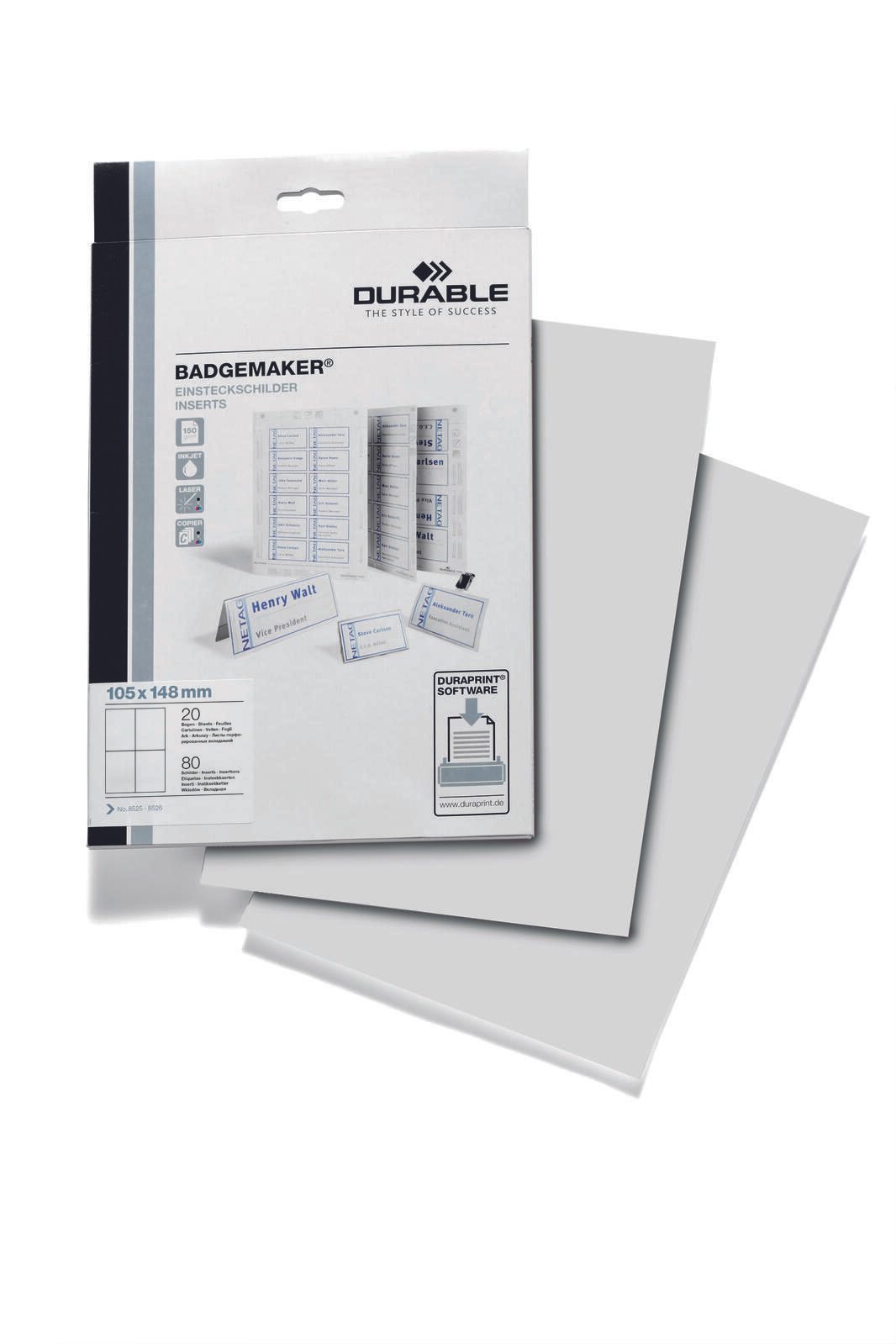 Die DURABLE Einsteckschilder für Namensschilder Badgemaker sind die perfekte Lösung, um deine Veranstaltungen professionell zu gestalten. Mit einem Etikettenmaß von 10,5 x 14,8 cm bieten diese Schilder ausreichend Platz für alle wichtigen Informationen. Die Schilder sind auf praktischen DIN-A4-Bögen angeordnet, was die Handhabung und den Druck besonders einfach macht. Die schlichten weißen Einsteckschilder aus hochwertigem Karton überzeugen durch ihre mattierte Oberfläche, die nicht nur ansprechend aussieht, sondern auch eine hervorragende Beschreibbarkeit bietet. Egal, ob du einen Laser-, Inkjet- oder Kopierer verwendest, die Schilder lassen sich problemlos bedrucken. Auch eine Beschriftung von Hand oder mit einer Schreibmaschine ist möglich, sodass du die Flexibilität hast, deine Namensschilder ganz nach deinen Wünschen zu gestalten. Mit der microperforierten Struktur sind die Einsteckschilder leicht abtrennbar, was die Vorbereitung deiner Veranstaltung erheblich erleichtert. Zudem sind sie blickdicht, sodass alle Informationen klar und deutlich zur Geltung kommen. Ein Pack enthält 80 Stück, was sie zu einer idealen Wahl für größere Events oder regelmäßige Anwendungen macht. Die DURABLE EVENT-Namensschilder sind speziell für diese Einsteckschilder geeignet, sodass du sicher sein kannst, dass sie perfekt zusammenpassen. Die abgerundeten Ecken sorgen für ein ansprechendes Erscheinungsbild und verhindern, dass die Schilder an den Kanten ausfransen. Vertraue auf die Qualität von DURABLE und sorge dafür, dass deine Namensschilder professionell und einladend wirken. Diese Einsteckschilder sind eine unverzichtbare Ergänzung für jede Veranstaltung, die Wert auf ein gepflegtes und strukturiertes Auftreten legt.Technische Daten